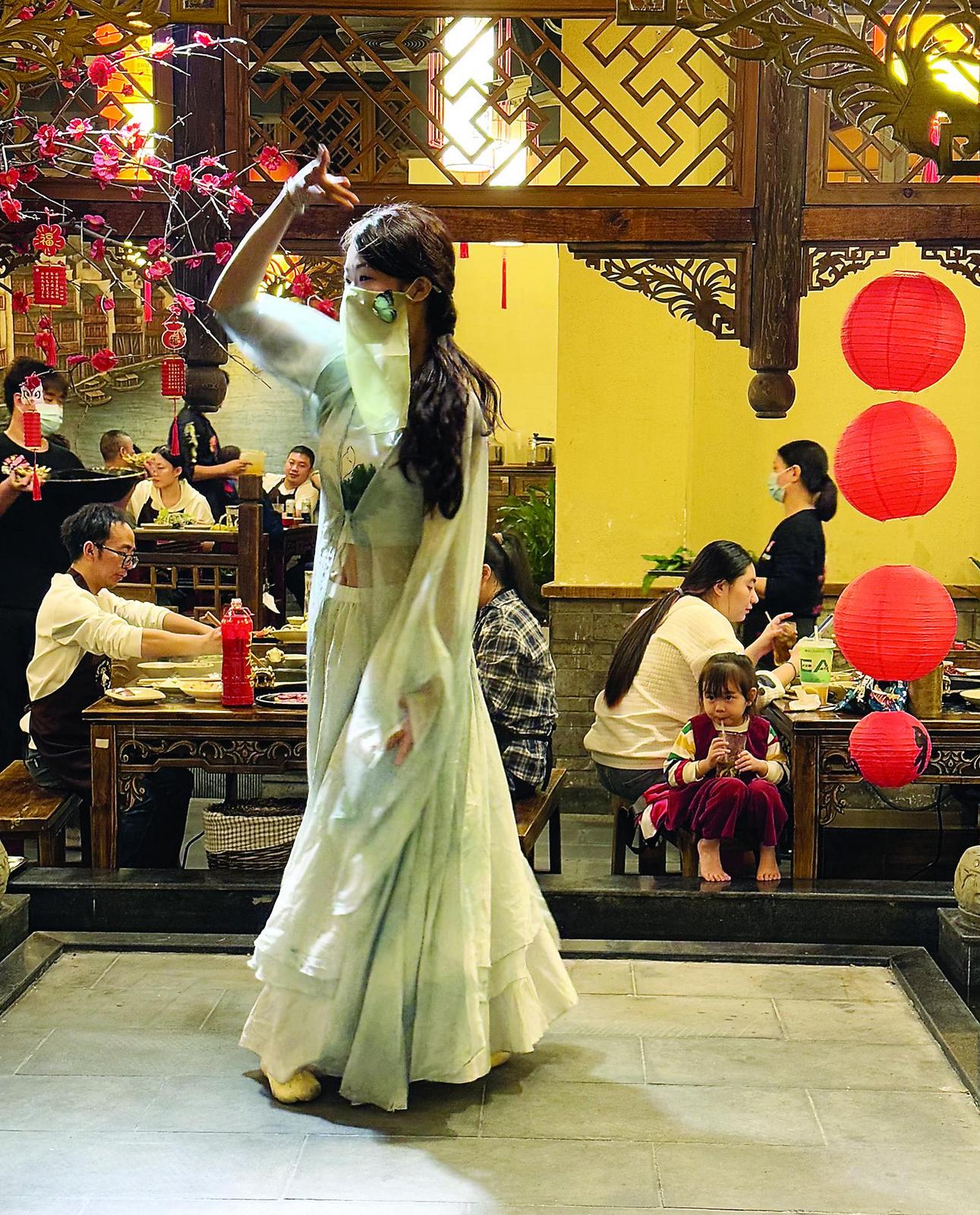 一锅“热辣”煮出暖意,一支“热舞”驱散寒意。火锅店员工在表演节目。