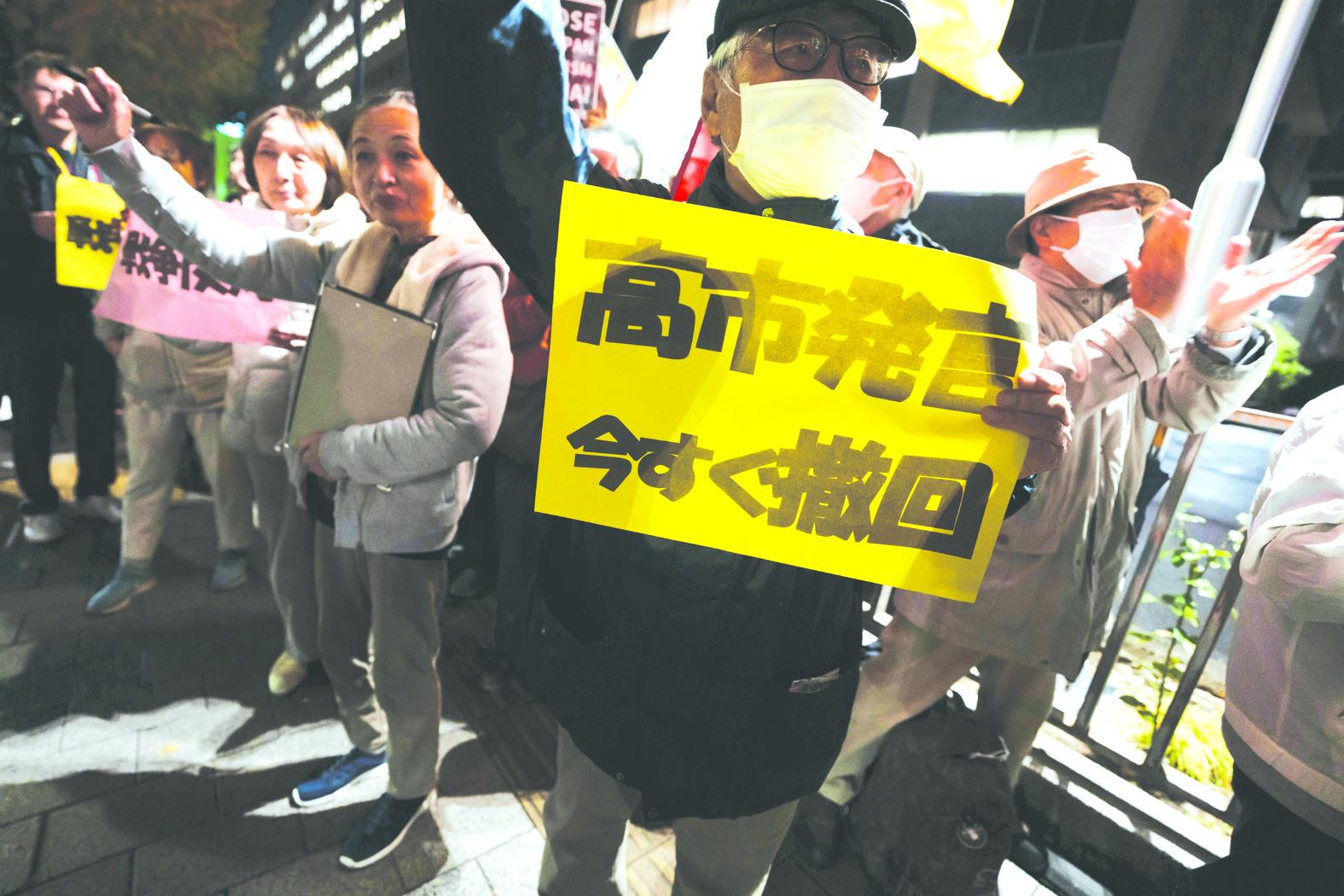 抗议者大内真纪子对记者说,她认为高市涉台错误言论造成日中关系恶化,“日本旅游业已经受到巨大冲击,社会氛围也明显变得更紧张”。