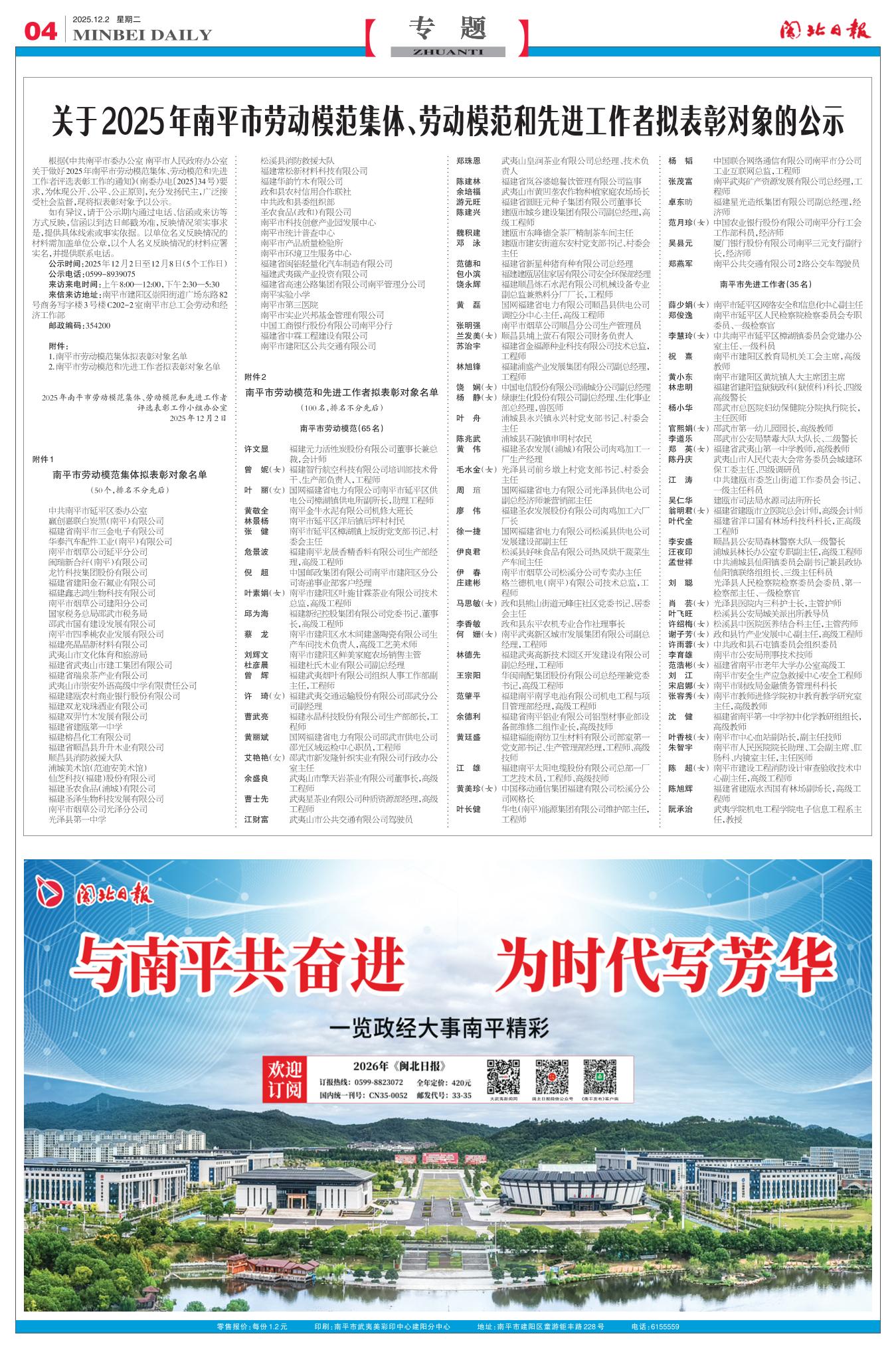 根据《中共南平市委办公室 南平市人民政府办公室关于做好2025年南平市劳动模范集体、劳动模范和先进工作者评选表彰工作的通知》(南委办电〔2025〕34号)要求,为体现公开、公平、公正原则,充分发扬民主,广泛接受社会监督,现将拟表彰对象予以公示。