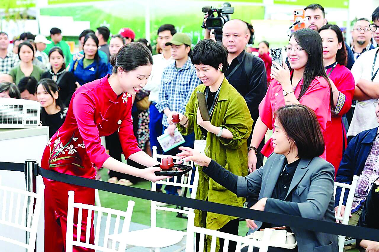 越南河内国际咖啡展暨茶叶展上,大红袍茶艺表演引得越南茶商与爱好者纷纷驻足拍摄。