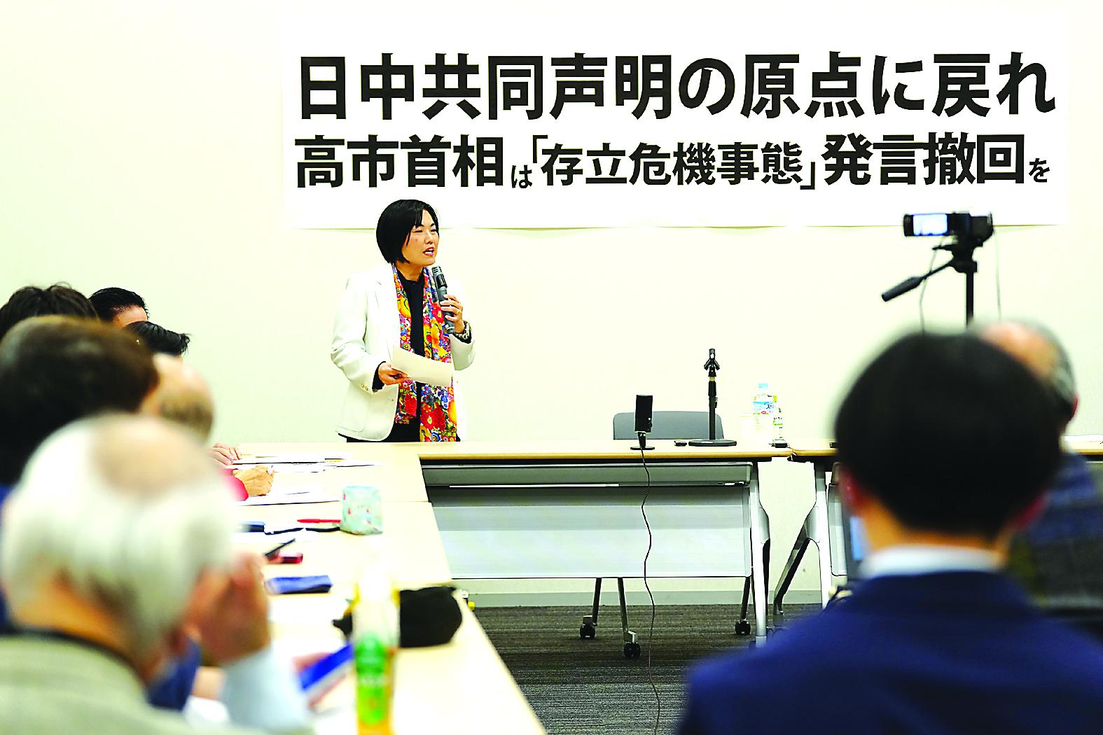 集会主题为“要求高市首相撤回‘存亡危机事态’相关言论,回到日中邦交正常化的原点”。日本前外务省官员孙崎享指出,高市的发言破坏了1972年《中日联合声明》。日本青山学院大学名誉教授羽场久美子表示,高市的涉台言论极其危险,明显违反日本国宪法第九条,同时也违反国际法。