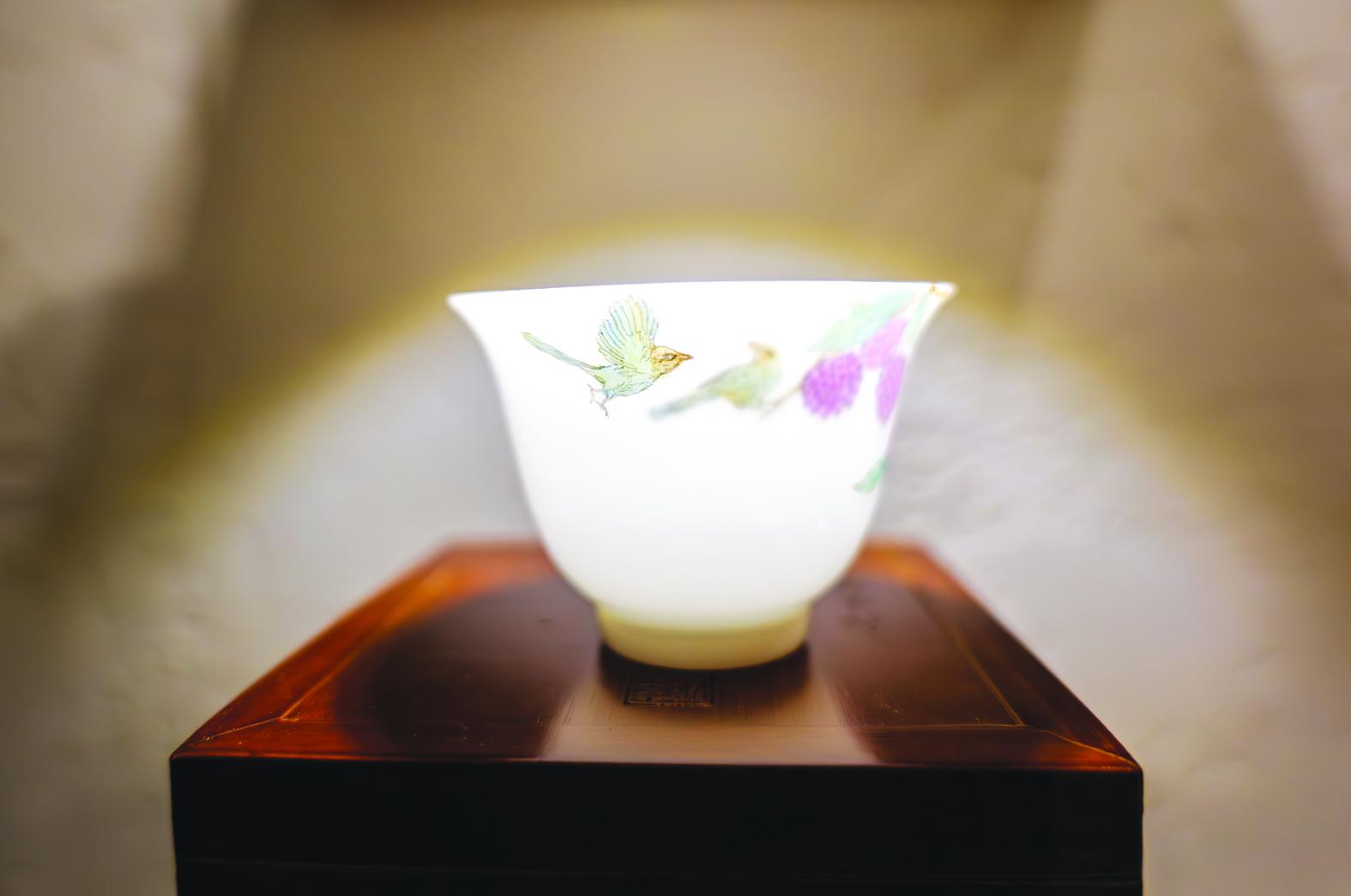 大口窑青白瓷茶杯《错位空间》,坯薄0.28毫米、18克重,薄胎内、外壁可见两只飞鸟图案。
