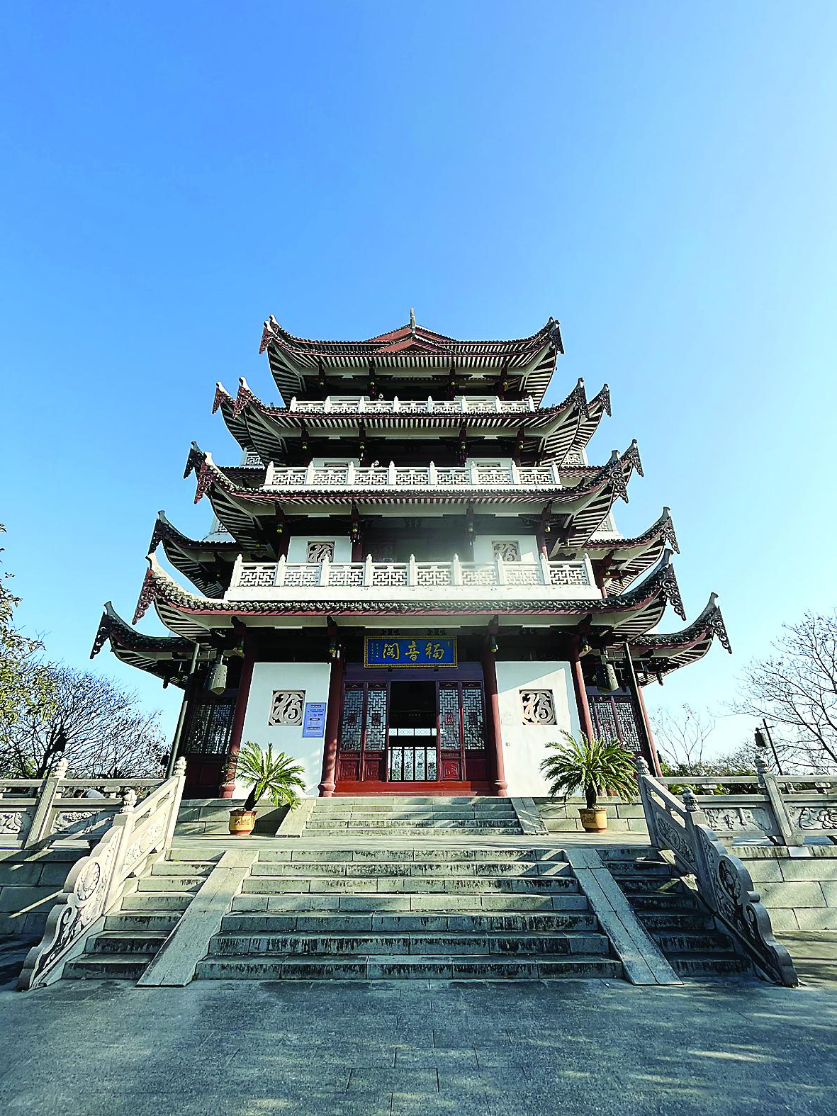 福音阁始建于2011年,作为福山“福”文化的核心载体,其“福音阁”牌匾由国学大师文怀沙题写,字形端庄,行笔有力。每每伫立在福音阁前,我眼前便浮现文先生笔走游龙的场景,闻到墨香,感到书法的魅力。每逢新年,阁顶层钟楼洪亮的钟声响起,便似福祉传遍全城,故而得名“福音阁”。