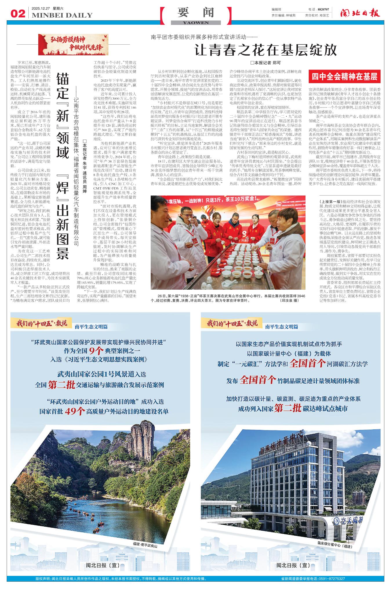 周祖翼说,使命催人奋进,实干成就未来。对标对表党的二十届四中全会精神,省委十一届九次全会提出了“十五五”时期福建经济社会发展的总体要求、主要目标和重点任务。要保持战略定力,增强必胜信心,坚持把福建工作放到党和国家事业发展的全局去思考、谋划和推动,在中国式现代化建设中奋勇争先,奋力谱写新征程新福建建设新篇章。一是必须坚持不懈用习近平新时代中国特色社会主义思想凝心铸魂,勇争强化理论武装之先。要发挥福建独特优势,加强系统化、学理化研究阐释,更好学思践悟党的创新理论,更加坚定自觉地用以武装头脑、指导实践、推动工作,切实增强学以致用、破解难题能力。二是必须坚决扛牢党中央赋予的重大使命,勇争服务国家战略之先。要与推动福建发展结合起来,统筹推进重大战略任务、重大改革举措、重大工程项目,做到既为一域增光、又为全局添彩。要高质量推进两岸融合发展示范区建设,深入探索新形势下推动融合发展的实践路径,更好服务祖国统一大业。三是必须切实担起经济大省挑大梁的重大责任,勇争推动高质量发展之先。要坚持稳中求进工作总基调,因地制宜、科学制定本地区本部门“十五五”发展目标,不断巩固拓展经济稳中向好势头。要聚焦提质增效,找准嵌入和服务“555X”产业集群发展的工作着力点,因地制宜发展新质生产力,推动经济实现质的有效提升和量的合理增长。四是必须把改革精神改革思维改革方法贯穿始终,勇争推进体制机制创新之先。要用好改革开放这个关键一招,大力弘扬改革开放精神,坚持正确改革方法论,加力破除制约高质量发展的体制机制障碍,加快重点领域和关键环节攻坚突破,彰显担当、创造经验,增强发展动力和社会活力。五是必须探索具有福建特色的共同富裕之路,勇争践行党的根本宗旨之先。要巩固拓展脱贫攻坚成果,聚焦缩小区域差距、城乡差别,处理好山与海、城与乡、发展与保护、发展与民生的关系,推动经济和社会协调发展、物质文明和精神文明相得益彰,让现代化建设成果更多更公平惠及全省人民。六是必须激发争优争先争效的昂扬斗志,勇争锻造过硬作风之先。要坚持高站位、大格局、宽视野,在履职尽责的实际行动中锐意进取、开拓创新,激发干事创业精气神。以永远在路上的坚韧和执着纵深推进全面从严治党,推进各领域基层党组织建设,鲜明树立正确选人用人导向,引领带动各级党员干部敢担当、善作为、勇争先。