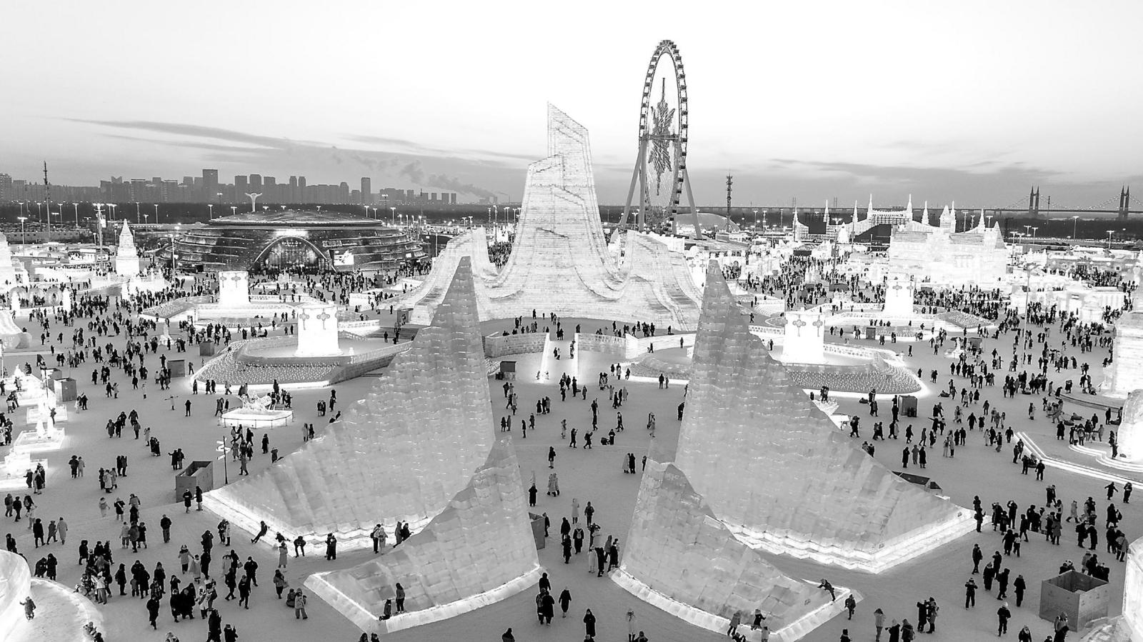 2026年1月1日,游客在哈尔滨冰雪大世界园区内游玩,欢庆新年的到来(无人机照片)。