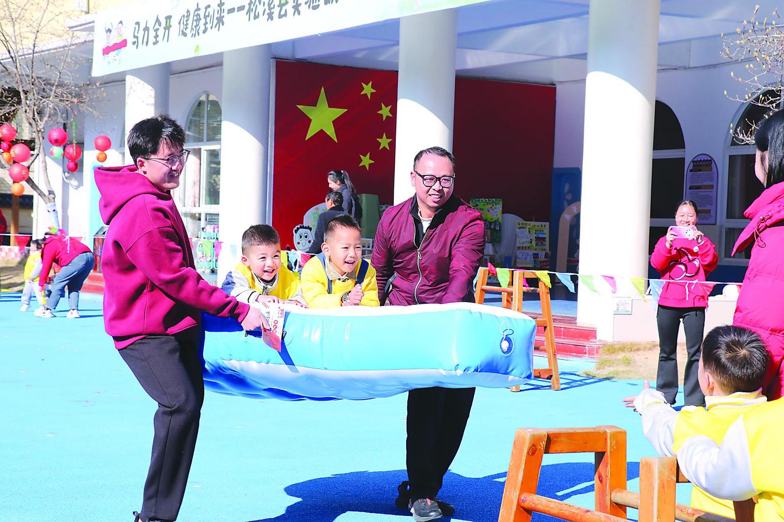 元旦前夕,松溪县实验幼儿园内欢笑声阵阵,一场充满趣味的亲子运动会在此举行。孩子们与家长在互动游戏中亲密协作、传递快乐,共庆新年。 (李思敏 吴鹏 摄)