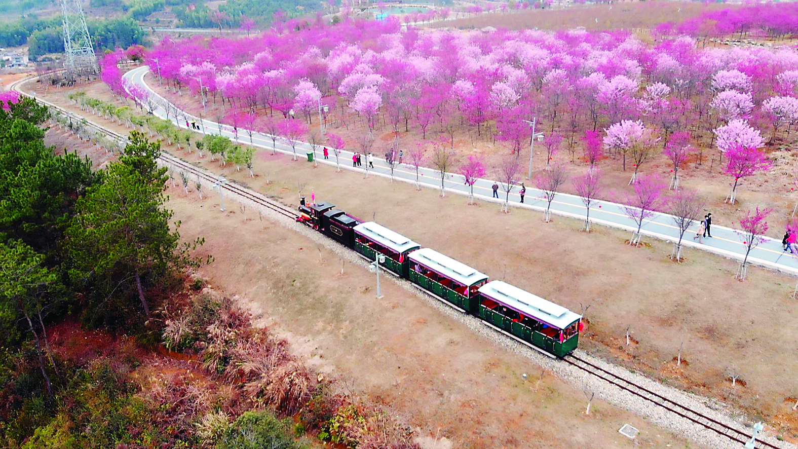 大埠岗樱花小镇是集农业观光、休闲旅游、民俗体验与太极养生于一体的国家级樱花特色小镇,小镇内精心培育了中国红、牡丹樱等多个优质品种,苗木总量达30万株。每年2月初至3月底,漫山樱花次第绽放,如云似霞,吸引游客纷至沓来。今后,该镇还将不断升级樱花园旅游设施,丰富多元旅游业态,吸引更多游客前来打卡。图为日前,游客乘小火车游览小镇。 (何水树 摄)