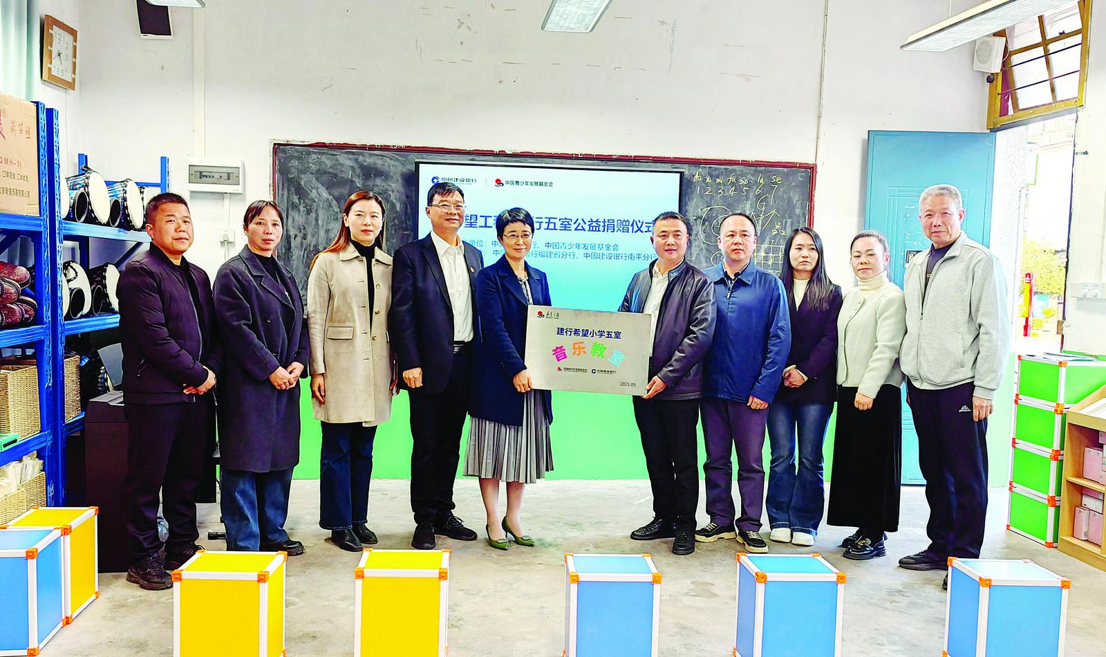 本报讯(记者 许斌 通讯员 林富强 文/摄)近日,中国建设银行“希望工程·建行五室”公益项目捐赠仪式在建瓯市迪口镇中心小学举行,所捐赠的音乐教室在该小学也顺利落成。这不仅标志着一间设施完备的现代化音乐教室在乡村校园诞生,更是建行福建省分行践行“金融为民”初心、助力乡村教育振兴的生动写照。