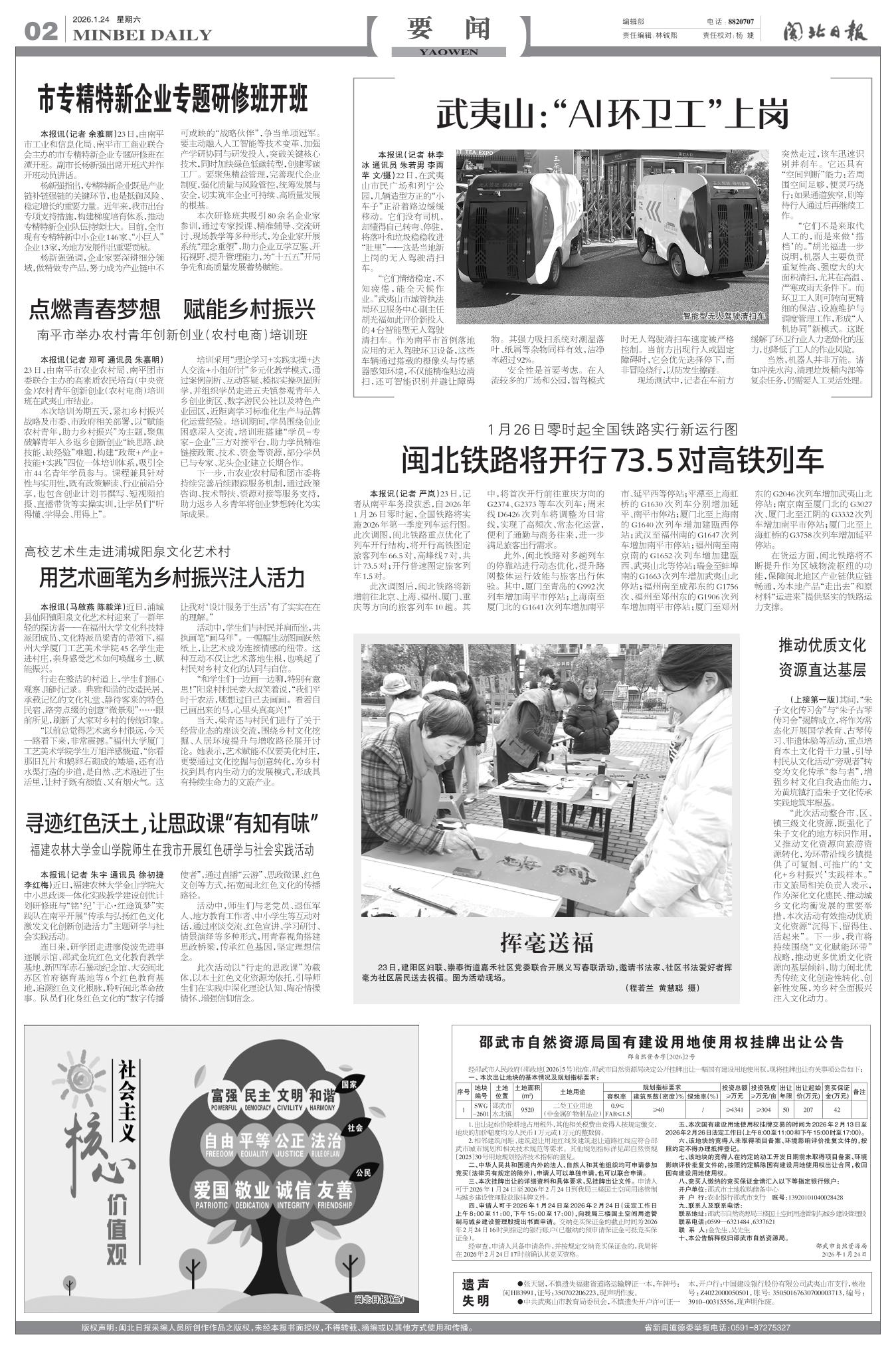 本报讯(记者 严岚)23日,记者从南平车务段获悉,自2026年1月26日零时起,全国铁路将实施2026年第一季度列车运行图。此次调图,闽北铁路重点优化了列车开行结构,将开行高铁图定旅客列车66.5对,高峰线7对,共计73.5对;开行普速图定旅客列车1.5对。