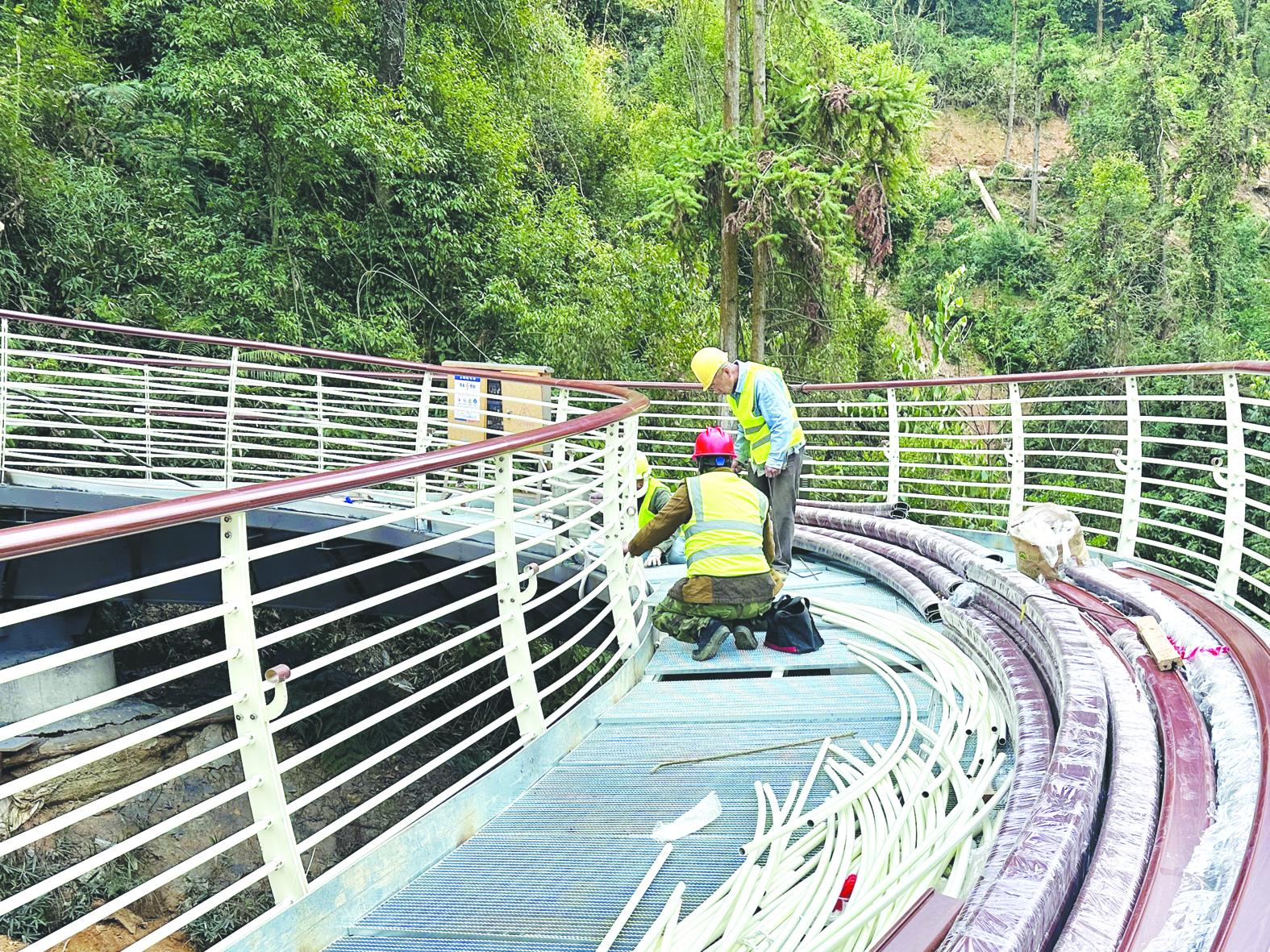 工人在对九峰山西塔步道进行钢隔板铺装 (缪韵 摄)