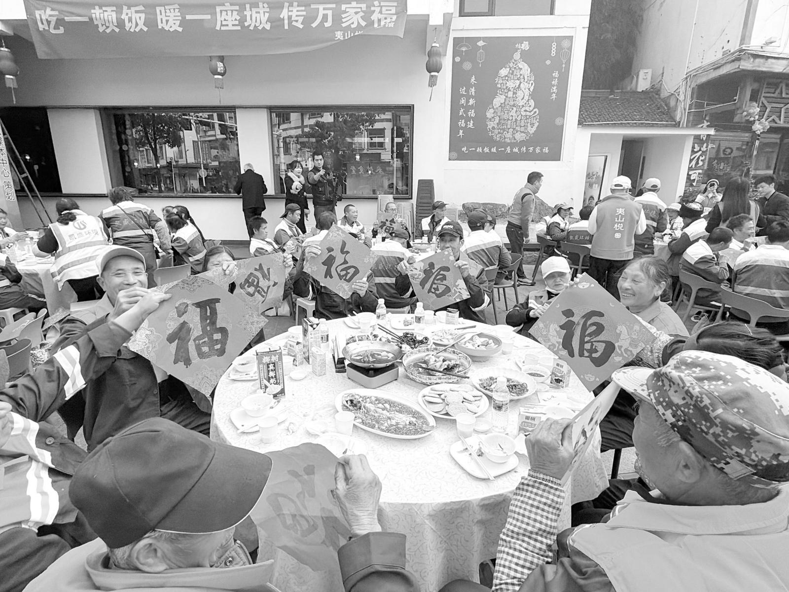 热气腾腾的熏鹅、文公菜……搭配香甜的腊八粥,一顿充满地方风味的午餐,让忙碌了一上午的环卫工人们暖胃又暖心。餐馆负责人吴坤祥穿梭在各桌之间,不时关切询问:“菜够不够?饭要不要再添?”他诚恳地说:“今天能请大家一起吃这顿饭,我心里特别高兴。但我想给予的更是一份长久的关怀——从今天起,我们店就是大家的‘暖心驿站’,免费提供茶水、充电服务,欢迎大家随时‘回家’!”