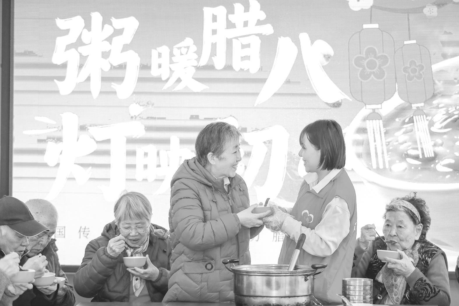1月26日是农历腊月初八“腊八节”,在山东省青岛市李沧区颐福养老院,志愿者为老人们送上腊八粥。