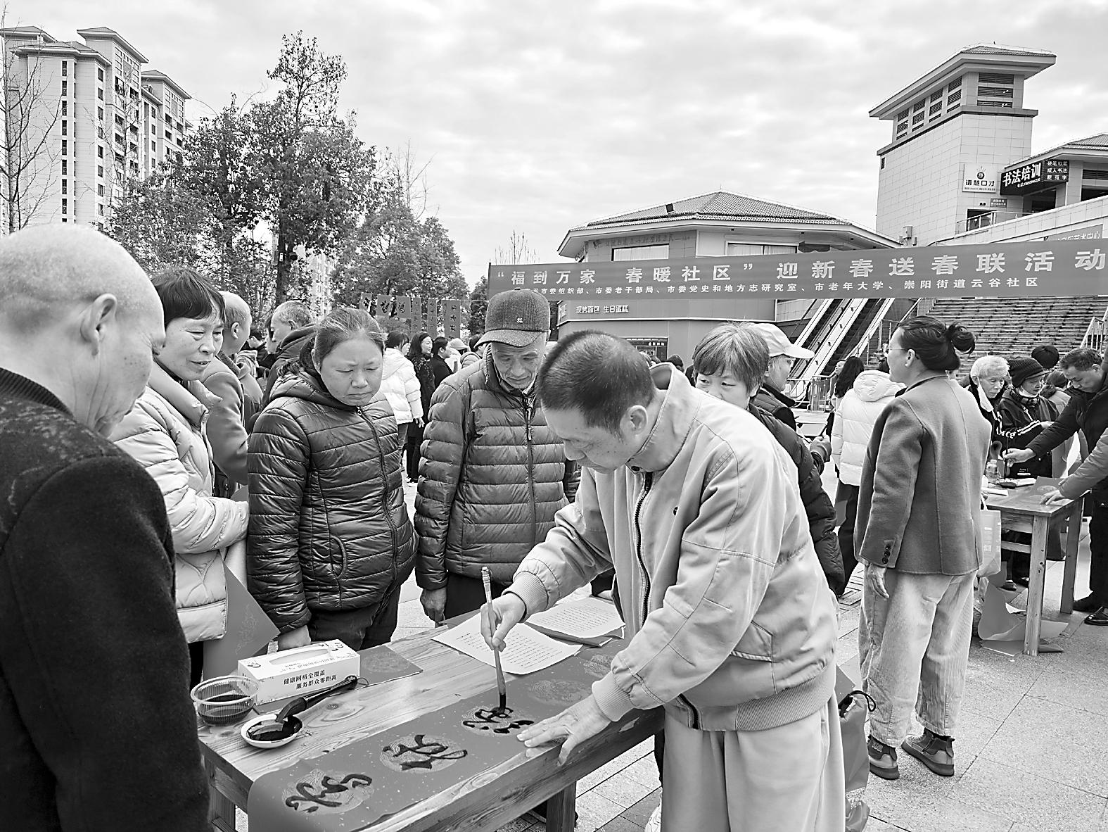 1月26日,“福到万家·春暖社区”迎新春送春联活动在潭举办。 活动现场,南平市老年大学书法学会成员和书法班师生挥毫泼墨,为市民免费书写满怀新春祝福的对联、“福”字。此次活动由市委组织部、市委老干部局、市委党史和地方志研究室、市老年大学与崇阳街道云谷社区联合举办,旨在弘扬中华优秀传统文化,丰富群众精神文化生活。图为活动现场。 (吕国珍 吴建琼 摄)