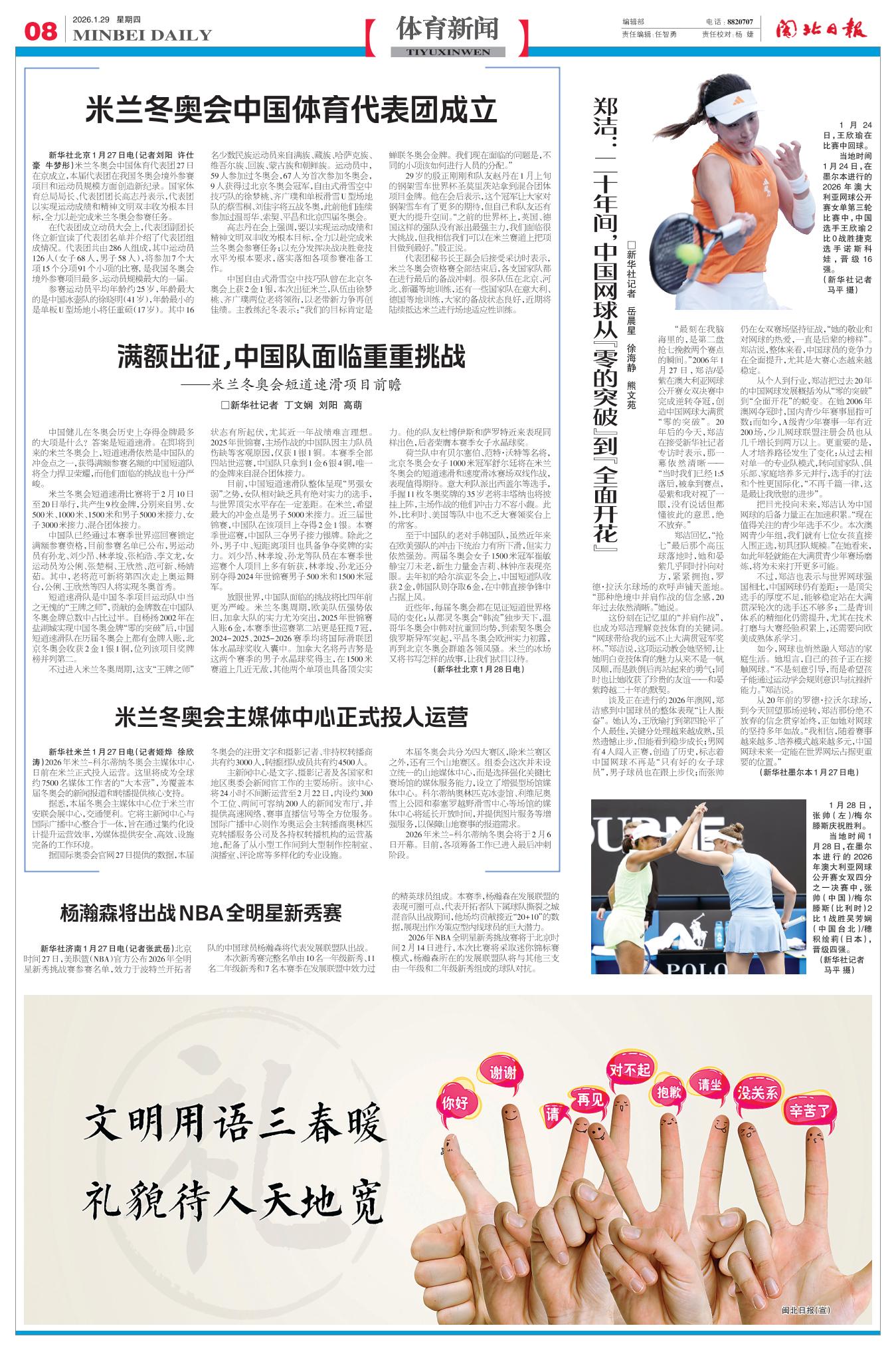 新华社北京1月27日电(记者刘阳 许仕豪 牛梦彤)米兰冬奥会中国体育代表团27日在京成立,本届代表团在我国冬奥会境外参赛项目和运动员规模方面创造新纪录。国家体育总局局长、代表团团长高志丹表示,代表团以实现运动成绩和精神文明双丰收为根本目标,全力以赴完成米兰冬奥会参赛任务。