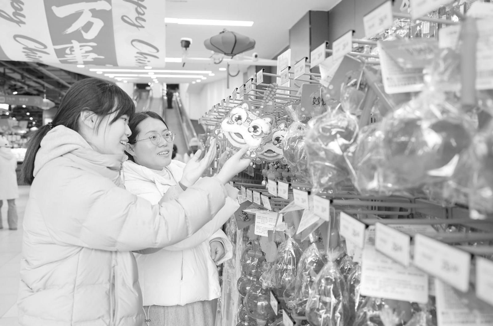 春节临近,我市各大商超换上“新年盛装”,年味十足,特色年饰、坚果礼盒、腊味生鲜、糖果零食……琳琅满目的商品吸引众多市民前来选购。图为邵武市民挑选心仪的节庆饰品。