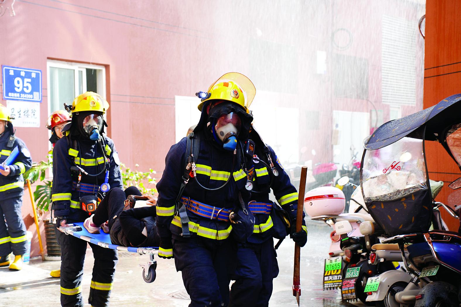 近日,武夷山市消防救援大队联合武夷山市应急管理局、崇安街道办事处、花桥社区、蓝天救援队等开展“高层防火筑屏障 木屋毗邻守平安”宣传进社区活动和实战化火灾应急演练,进一步强化应急队伍实战能力。图为演练现场。