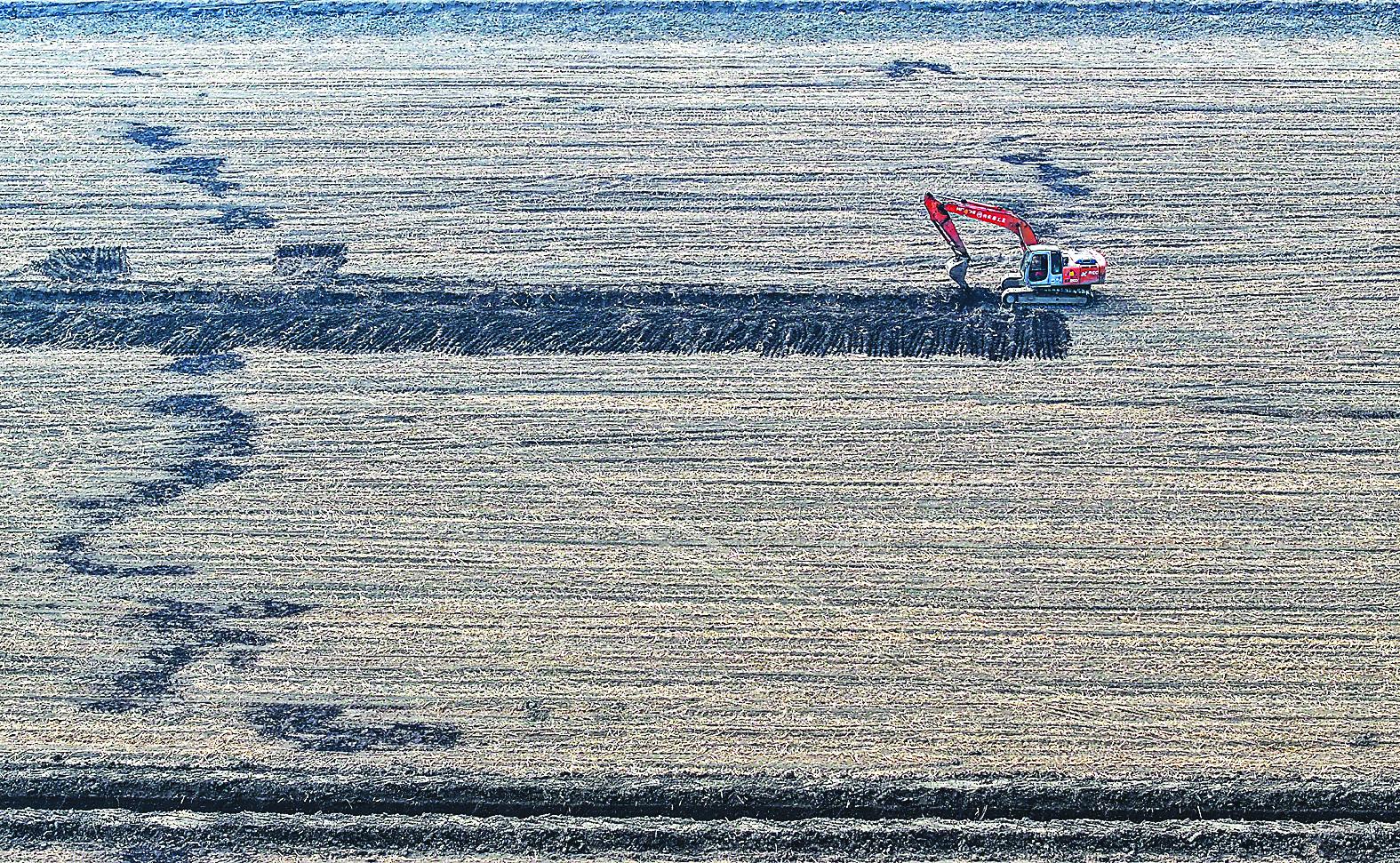 2025年3月11日,在天津市津南区八里台镇大韩庄村,工人驾驶挖掘机进行高标准农田施工作业(无人机照片)。 (新华社记者 赵子硕 摄)