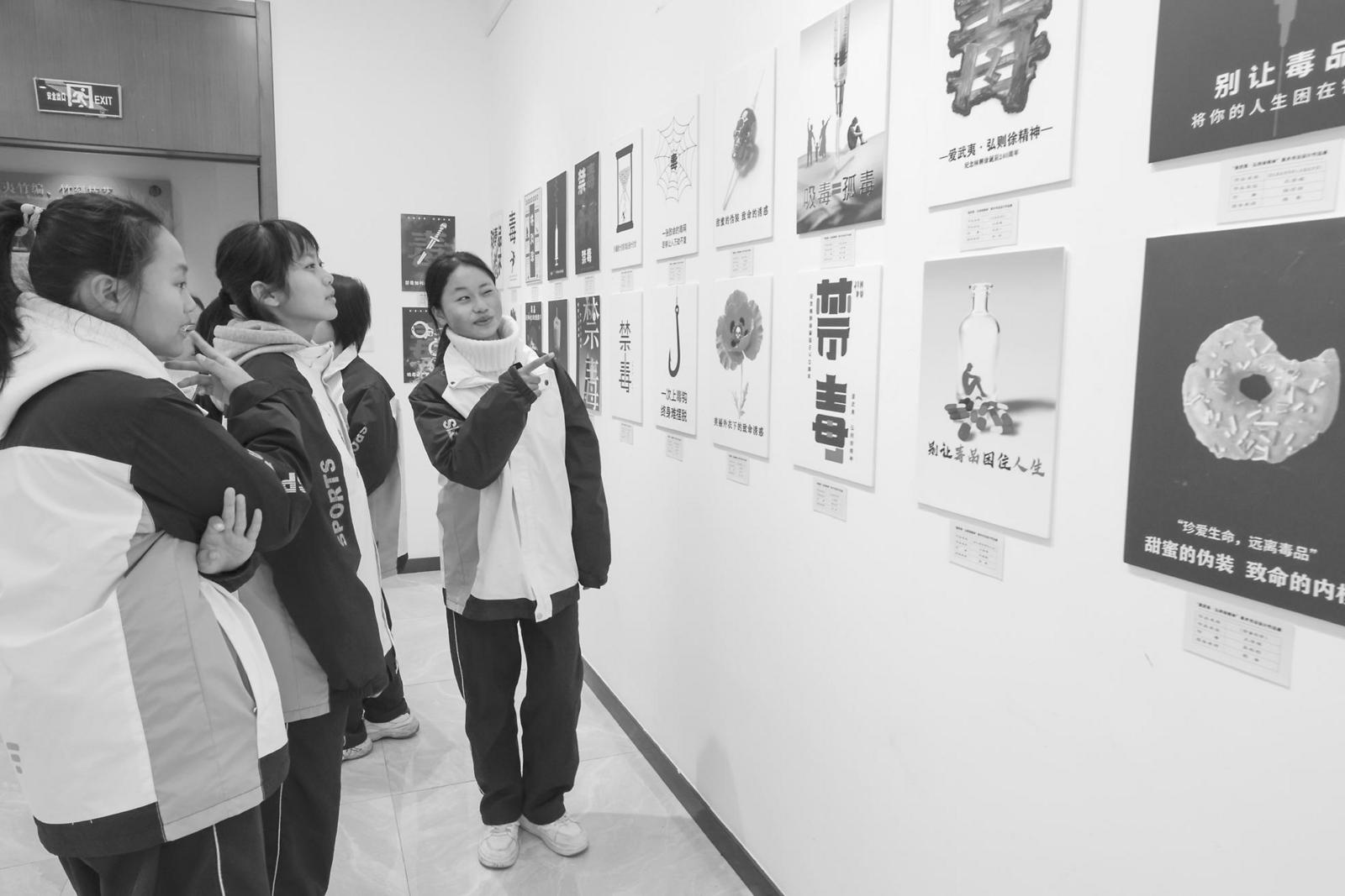 为纪念林则徐诞辰240周年,武夷山市举办首届大中小学美术书法设计作品展,通过书法、国画等艺术形式进一步弘扬禁毒先驱林则徐的爱国主义精神,提高群众识毒防毒拒毒意识和能力。图为2日,学生在参观作品展。 (邱汝泉 摄)