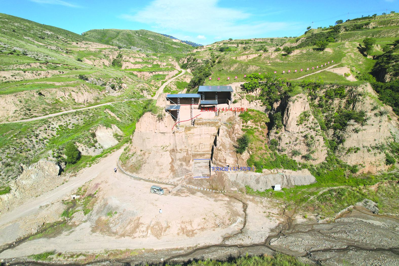 河北阳原县新庙庄旧石器时代遗址2号地点发掘区远景与文化层分布(资料照片)。