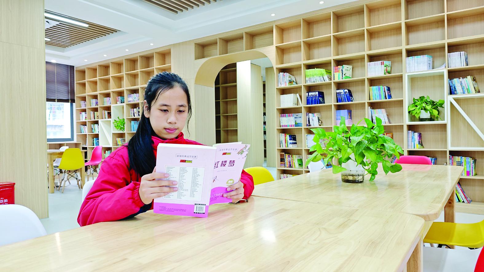 校园的蜕变,始于2024年。“一开始总听到轰隆隆的机器声,后来就看见工人叔叔们运来了新材料,熟悉的校园慢慢‘换新装’啦。”蔡安琪笑着回忆。新学期开学,走进教室的同学们纷纷眼前一亮:崭新的桌椅排列整齐,光滑的桌面再也不用垫书书写;护眼灯点亮教室各个角落,光线明亮又柔和;教室后方的落地书墙格外惹眼,《西游记》《海底两万里》等书籍整齐列队,静待同学们翻阅。下课后,书墙前总围着不少身影,阵阵欢笑传出教室。