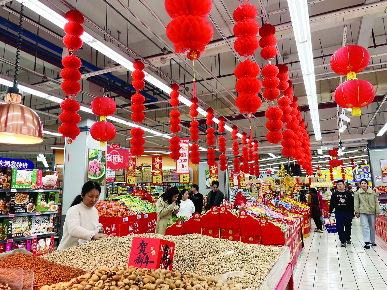 走入一家大型超市,在年货区,市民李女士正带着孩子挑选红灯笼、春联和“福”字贴。“每年过年都要换一套新的,红彤彤的挂在家里,才有过年的感觉。”她指着推车里已经选好的红色桌布、碗筷套装笑道,“连零食都要挑红色包装的,小朋友看着高兴。”货架旁,不少家庭正在比较各式红色装饰品,将“年味”装进购物车中。