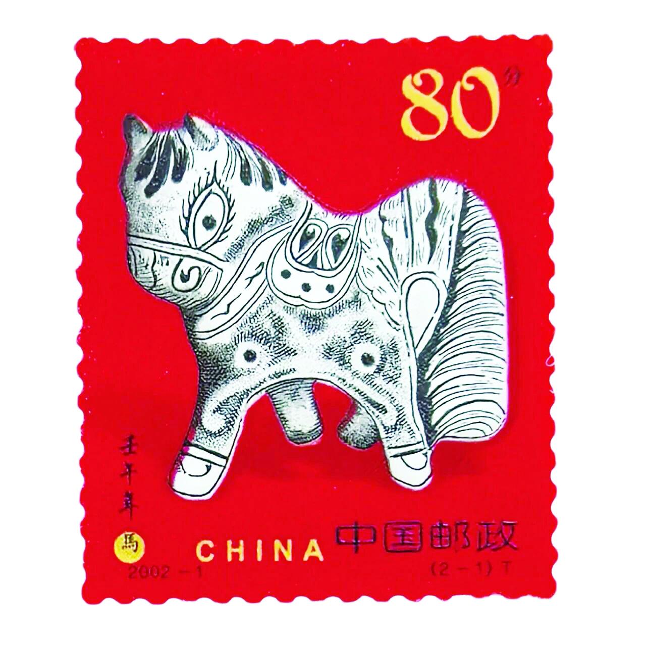 2002年1月5日,《壬午年》特种邮票发行,遵循第二轮生肖邮票“一套两枚”的形制,“两年平面(图案)、两年立体(工艺)”的生肖形象呈现规律,以及“篆、隶、草、楷三年一变”的书法字体轮换规则(此套规则是1992年第二轮生肖邮票开始就确立的)。第一枚邮票“马到成功”以陕西凤翔泥塑马为主角,背景铺以饱满鲜亮的大红色;第二枚“壬年大吉”则聚焦于汉字之美。中心是一个笔力遒劲、结构端庄的楷书“马”字,置于传统红色斗方之中。