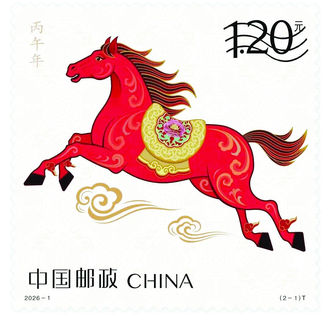 2026年1月5日发行的《丙午年》特种邮票,创新性地采用“大众评审+专家评审”双轨制评选模式。邮票全套两枚,分别名为“驰跃宏图”与“万骏臻福”。第一枚“驰跃宏图”,以一匹艳红色骏马为主体。第二枚“万骏臻福”则在橙红色底上描绘了黑、白、棕三匹骏马齐头并进的奔腾画面。 (李思敏 整理)