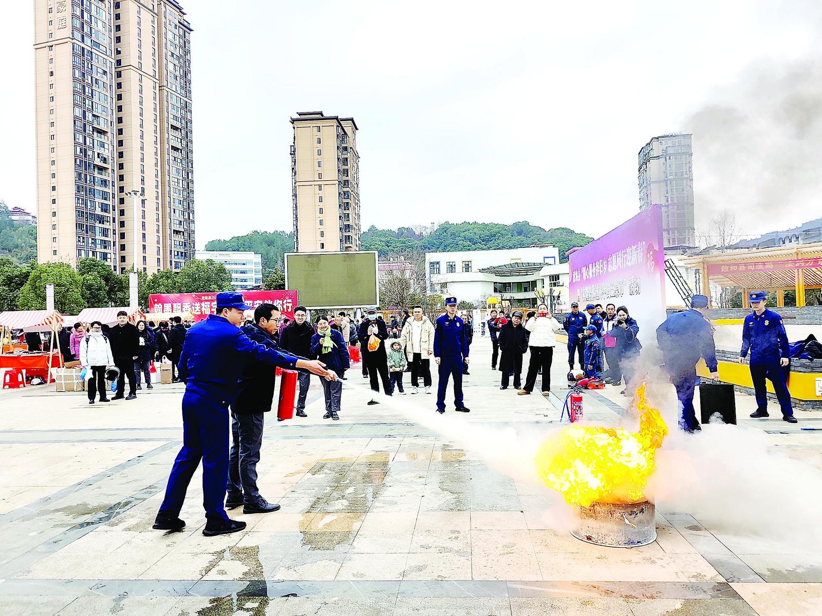 2月2日,政和县消防救援局联合新时代文明实践中心、县委社会工作部、融媒体中心等单位,在胜利洋市民广场开展“暖心服务辞旧岁 志愿同行迎新春”大型公益集市宣传活动。宣传人员设置了消防科普区,通过案例讲解、宣传展板展示、灭火器实操体验、液化气泄漏处置体验、消防栓射水体验等,宣讲普及家庭用火用电安全、冬季防火要点等消防安全常识。图为宣传人员指导群众使用灭火器。(邵康有 摄)
