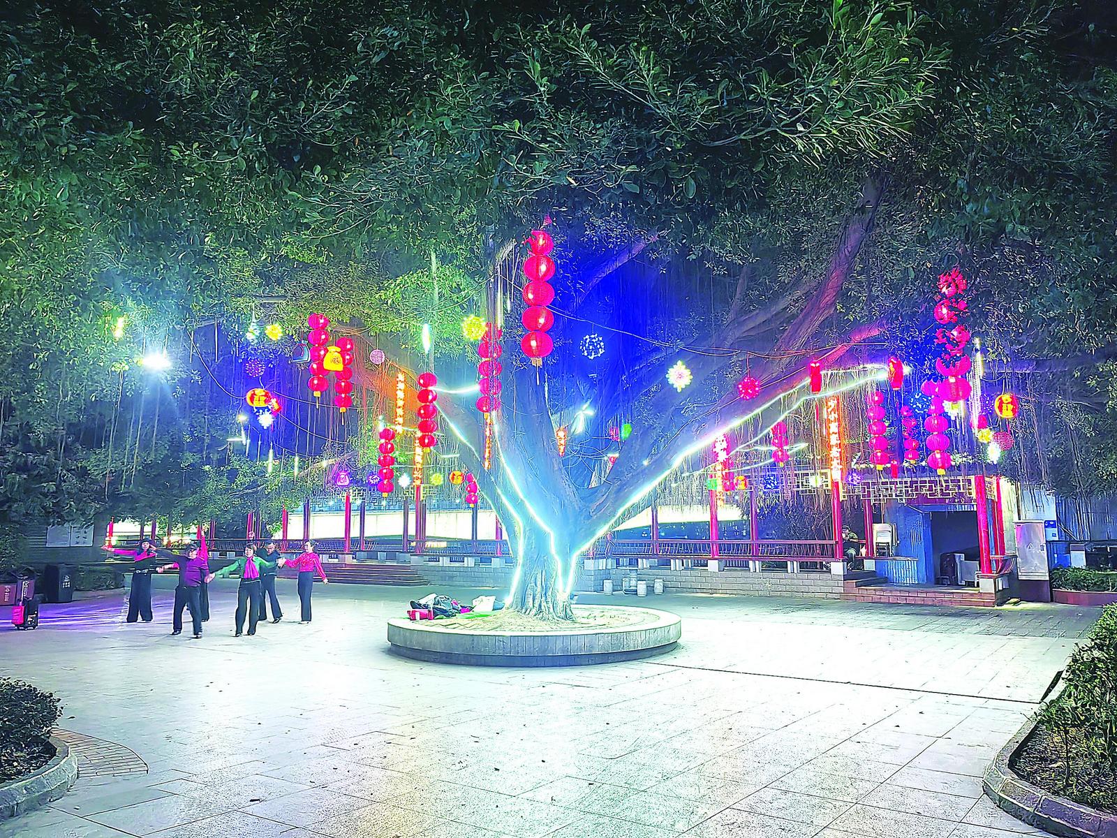 江滨公园的树上挂满红灯笼、藤球灯、造型各异的主题花灯(延平区园林服务中心供图)