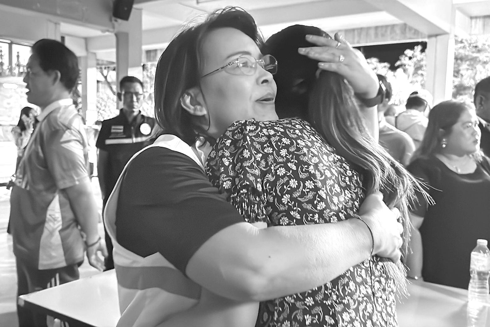 2月11日,两名女子在泰国宋卡府合艾县发生校园枪击案的学校互相拥抱。