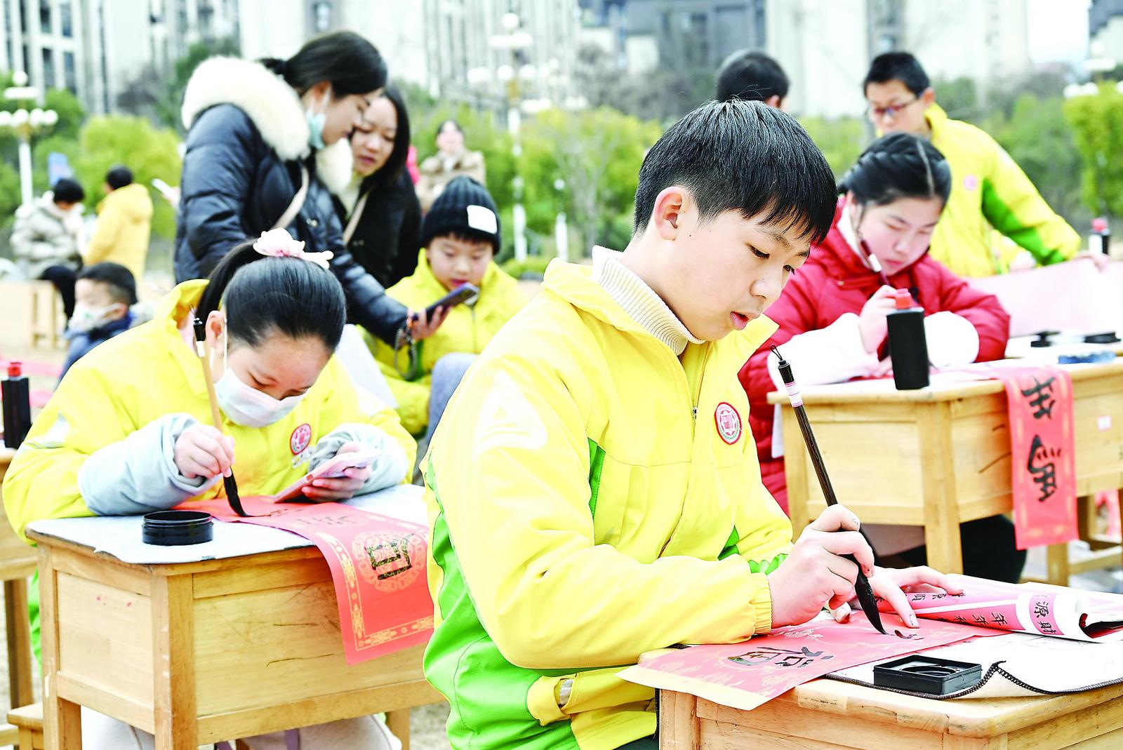 “作为全国书法教育示范校,我们坚持开展学生义务写春联活动已有二十余载,这项传统从未间断。”站在挂满墨香春联的花海公益书吧前的广场上,建阳区实验小学党总支书记李玮耐心地介绍这项具有公共意义的活动,他说,临近年关,学校还特别组织了书法集训,师生们利用课余时间精研技法、揣摩章法,还将校园文化与传统节庆、公共空间连接起来,在机关单位、社区街道等举办的各类迎新春活动中,将一副副饱含祝福的春联送到市民读者手中。