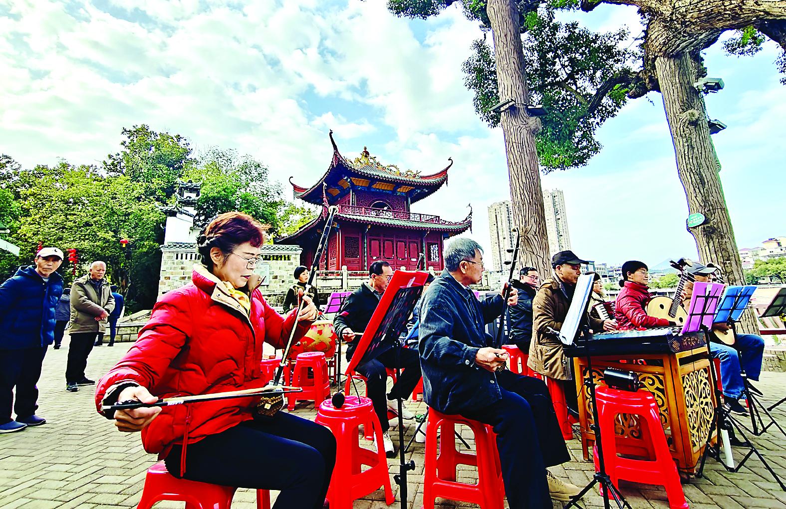 2月12日,在邵武市熙春公园,音乐爱好者奏响了《闹新春》,过年的“氛围感”提前拉满。