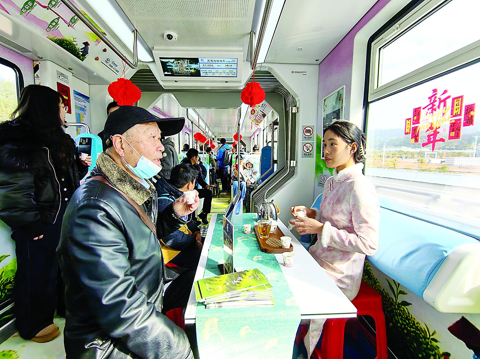 春节期间,福建南平武夷有轨电车有限公司推出新春文化专列,车厢内精心装点了红灯笼、福字窗花与马年吉祥文创元素,吸引了不少市民游客上车体验。此外,在南平市站、黄土站、东山埔站、武夷山站等重点站点,福建南平武夷有轨电车有限公司还设置了互动体验、打卡盖章、文创兑换等特色活动。图为19日,市民游客在“天心传景号”茶文化专列体验茶文化。 (张行健 陈颖 摄)