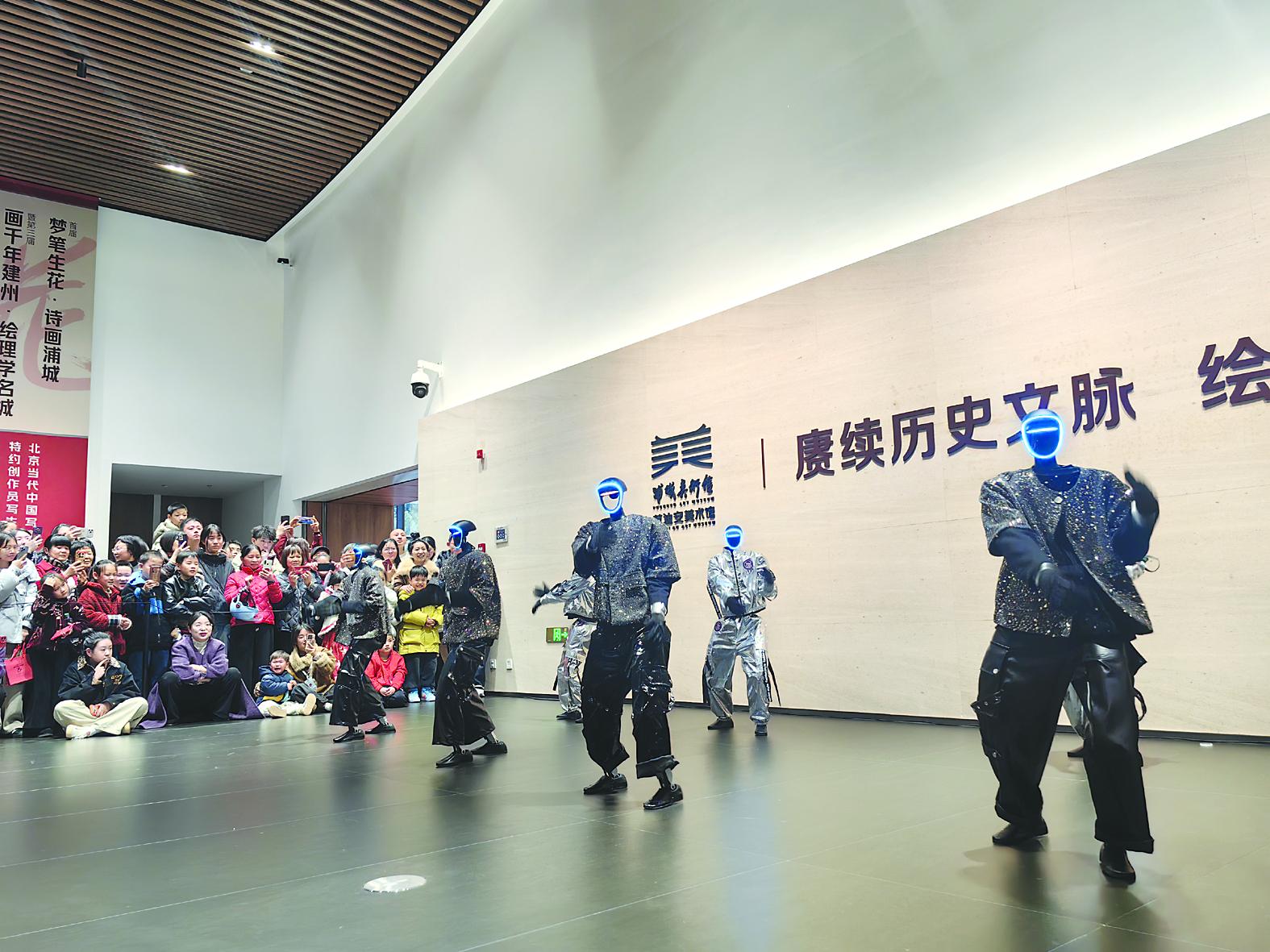 浦城美术馆/范迪安美术馆里,央视同款机器人表演天团的《海边有风浪》舞台秀周围水泄不通。八台银灰色机器人在光影交错中整齐列队,机械臂同时扬起,模拟麦浪翻涌,这种硬核的浪漫画面引来阵阵掌声。从江西上饶驱车两小时赶来的年轻情侣王子龙、郑苑伊举着云台全程直播,女孩兴奋地对着镜头喊:“太震撼了,在小县城居然能看到这种级别的科技秀!”