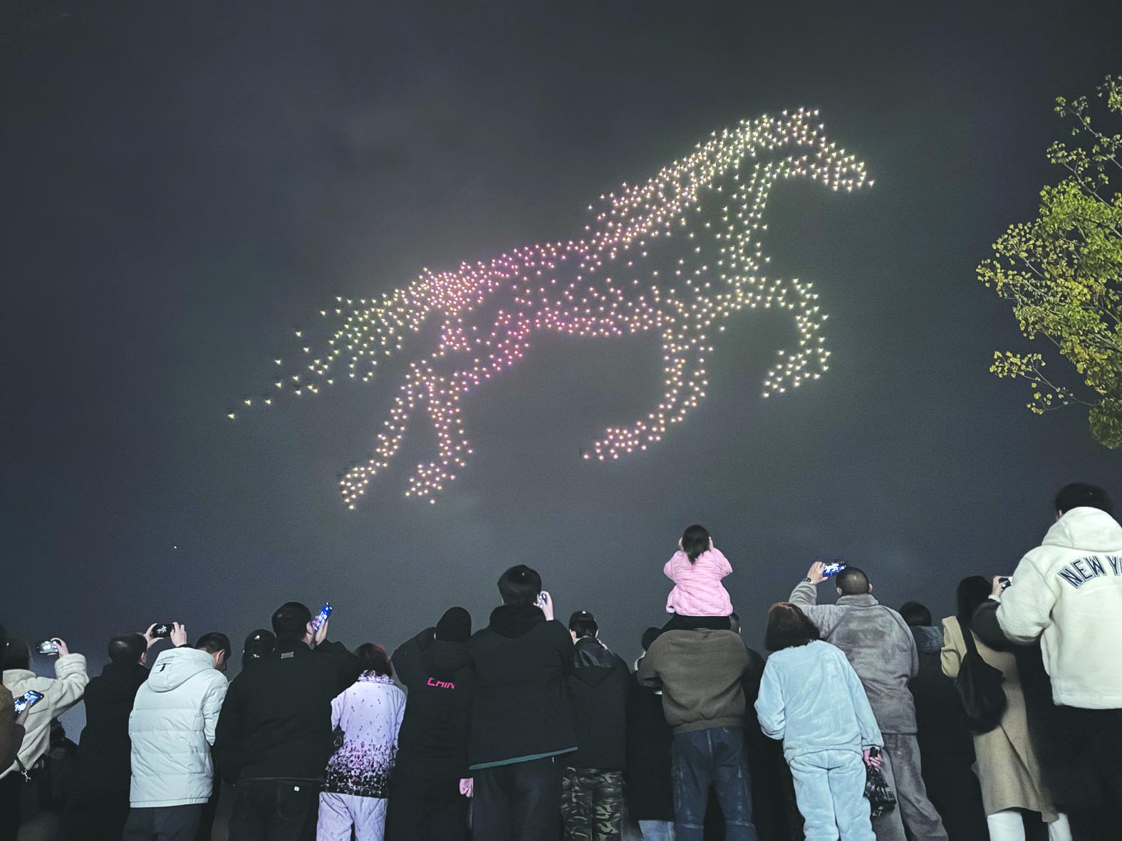 夜幕降临,梦笔文化园上演的“骏马踏梦·笔舞光澜”焰火与无人机秀结束了一天的精彩。焰火炸裂,金菊银柳倾泻如瀑,将南浦溪水面染成流动的琥珀色,1000架无人机随后自草坪腾空而起,倏忽间散作漫天星斗。市民徐谦站在人群中仰头拍了10多分钟:“朋友圈九宫格根本装不下,得发视频。今年春节浦城活动不断、年味十足,我深深感受到,家乡在用最好的东西迎接我们回家。”