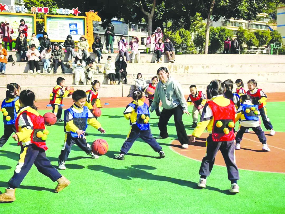 在水东附属幼儿园的运动课程上,孩子们正在练习球类训练。专职体育教师的介入,为幼儿园体育教学注入全新活力,让规范的动作示范、科学的活动组织成为课堂常态,极大激发了幼儿的运动兴趣与参与热情。“幼儿园老师清一色都是女性,在男性体育教师的带动下,让幼儿更具安全感与探索精神。”水东学校附属幼儿园教师告诉记者,学校还积极招募男性家长志愿者参与各学段体育教学与活动组织,为师资衔接增添新动能。