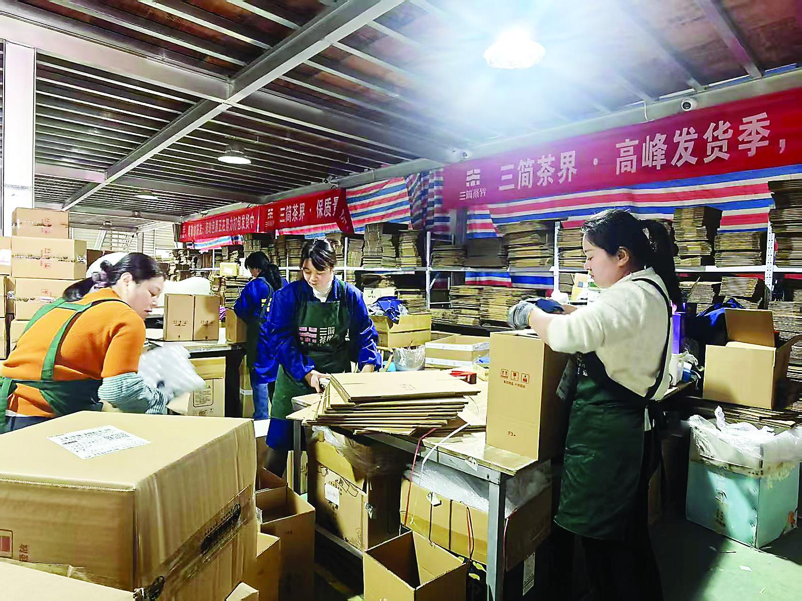 武夷山三简茶界电商产业园里,员工正加紧赶制产品。