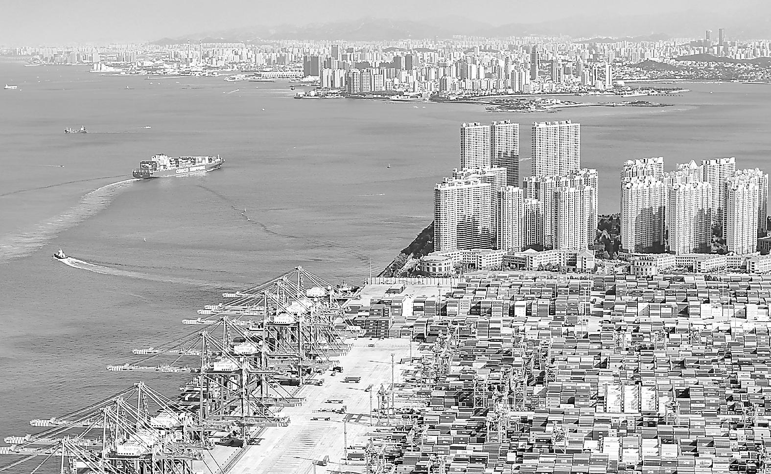 一艘货轮满载货物驶出青岛自贸片区(2025年11月5日摄,无人机照片)。