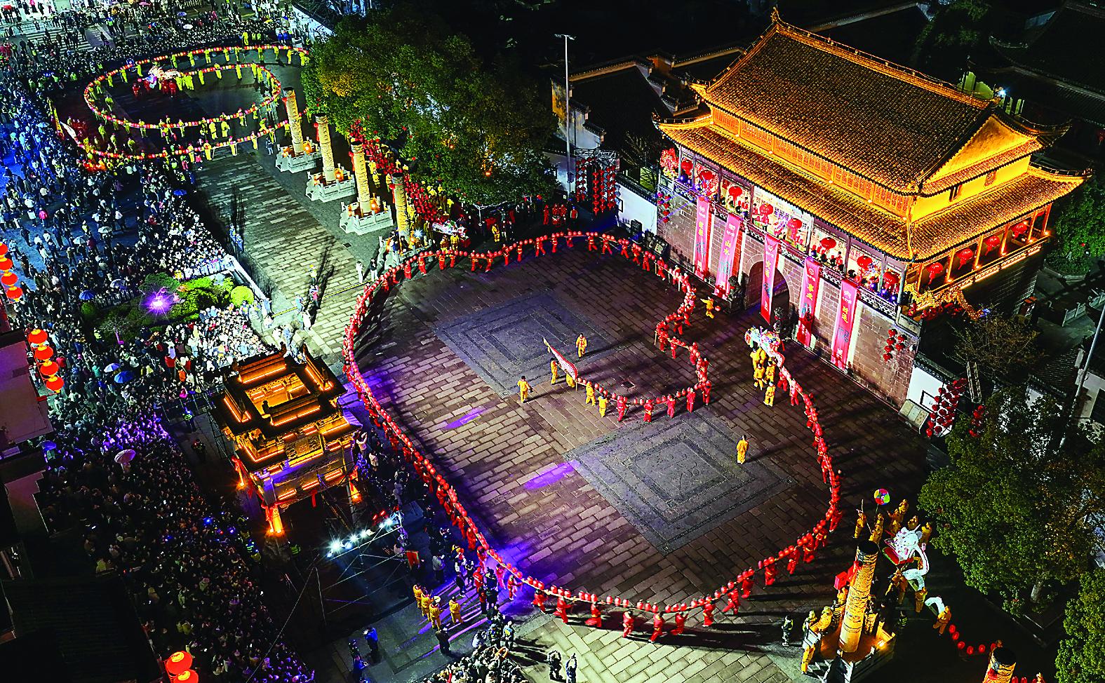 农历正月十二,安徽省黄山市休宁县“福满状元城”舞龙大会在状元广场热闹开演。百米长的非遗民俗徽州板凳龙在街巷间穿梭游动,与钟鼓楼相映成辉,喜迎元宵佳节。