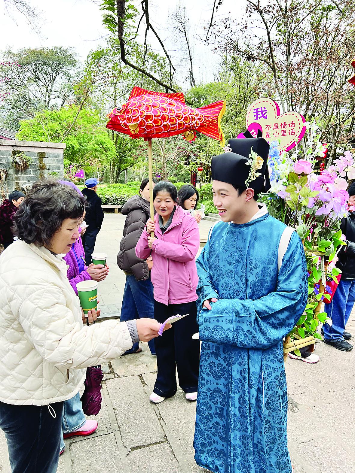 “客官,今日可有好诗相伴?”日前,武夷宫景区内身着宋代服饰的“卖花郎柳永”穿梭其间,手持“福抱”“且吃茶去”等字牌,与游客对诗互动,送出“福报”书签,成为宋街上最风雅的一道风景线。