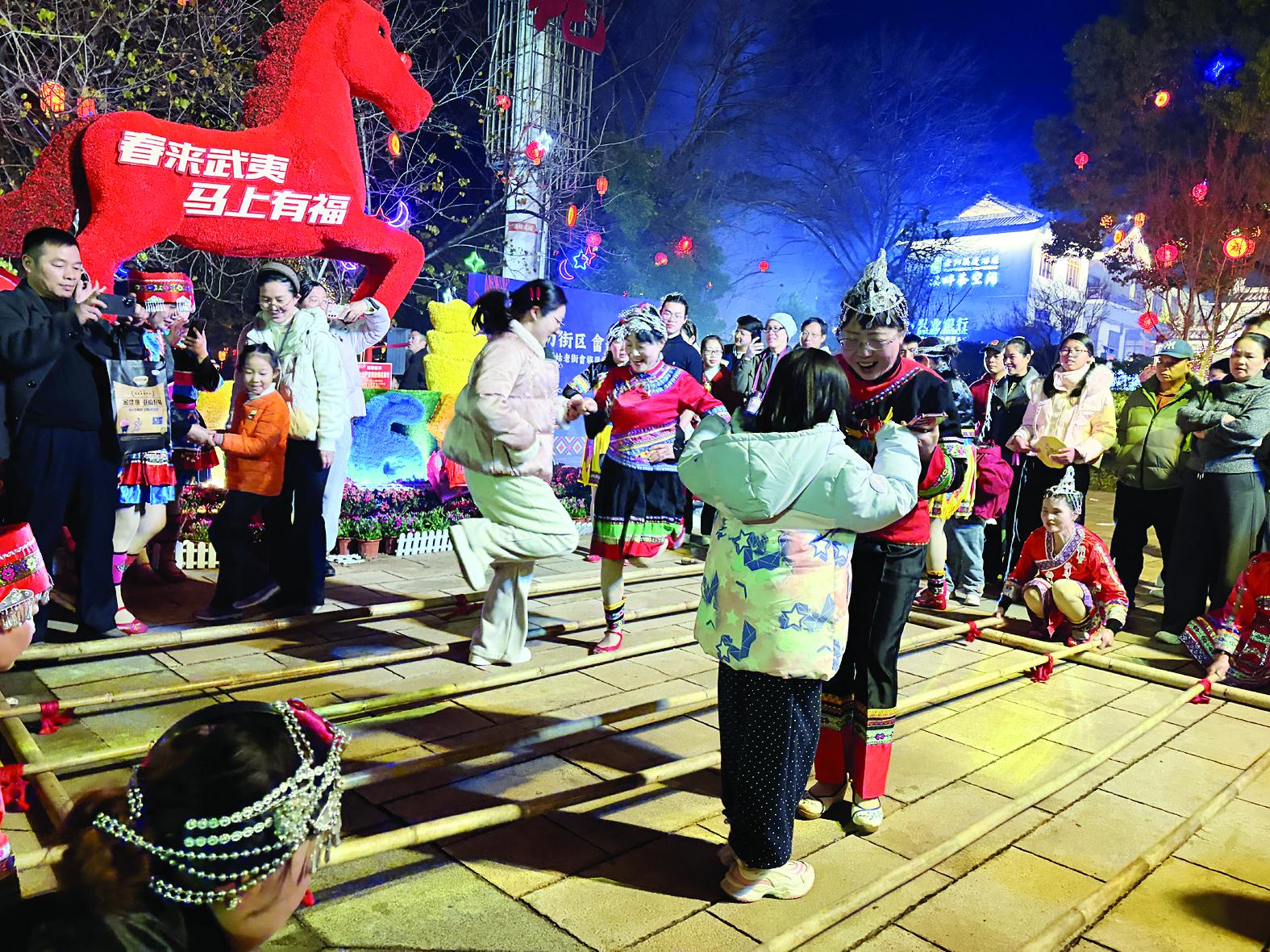 “氛围很浓,特别有感染力,我们就是奔着武夷山的年味来的!”来自江苏的费先生带着家人加入竹竿舞队伍,脸上笑意难掩。他们专程远道而来,沉浸式感受闽式福年的独特魅力。