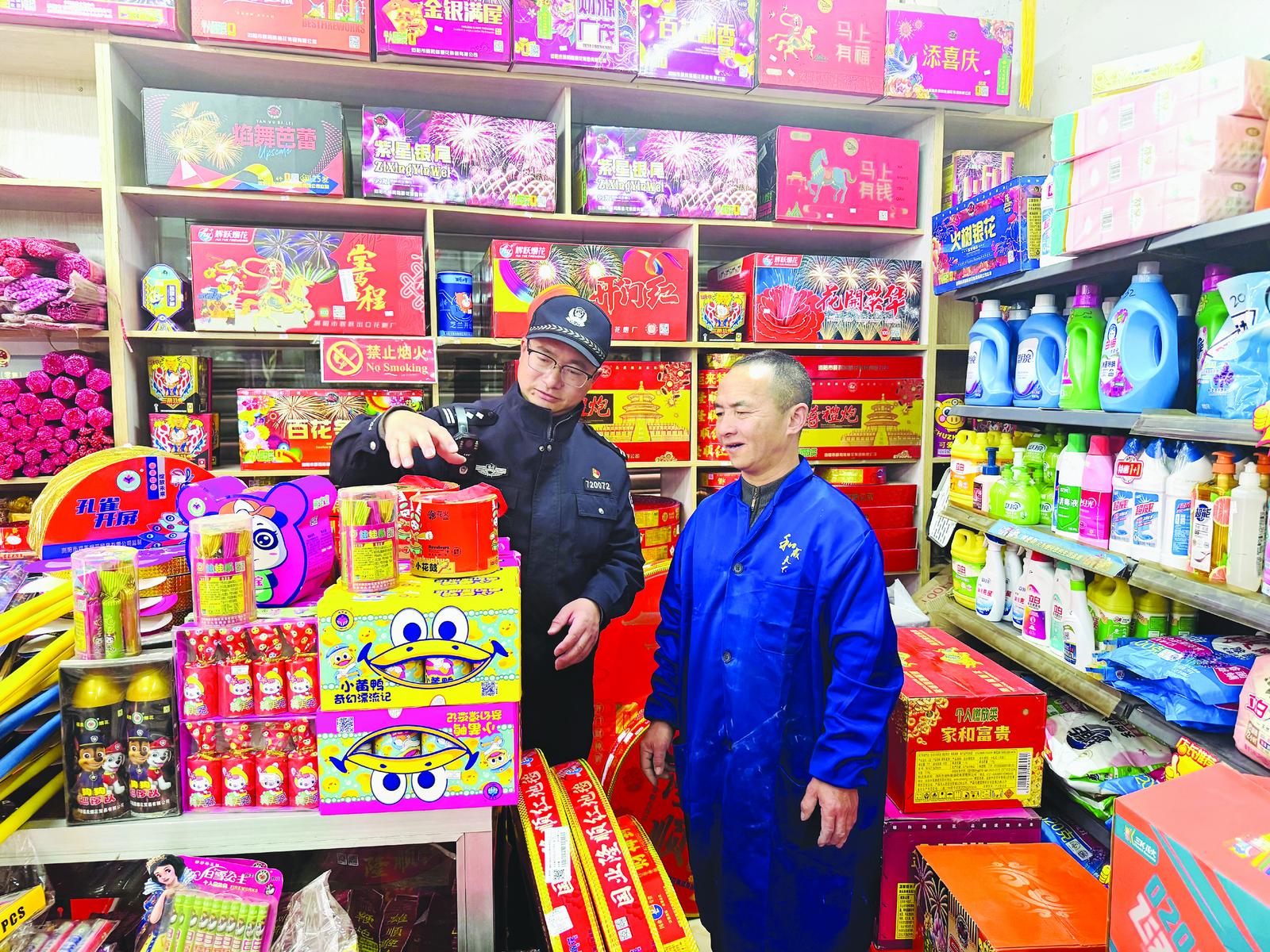 连日来,邵武市公安局组织所队民警对辖区内烟花爆竹零售经营点开展全覆盖安全检查,聚焦经营资质、储存条件,消防设施、产品质量等关键环节,逐店逐项细致排查,切实把好烟花爆竹安全关。图为2月28日,民警对烟花爆竹销售点进行安全检查。 (黄义清 连梓轩 摄)