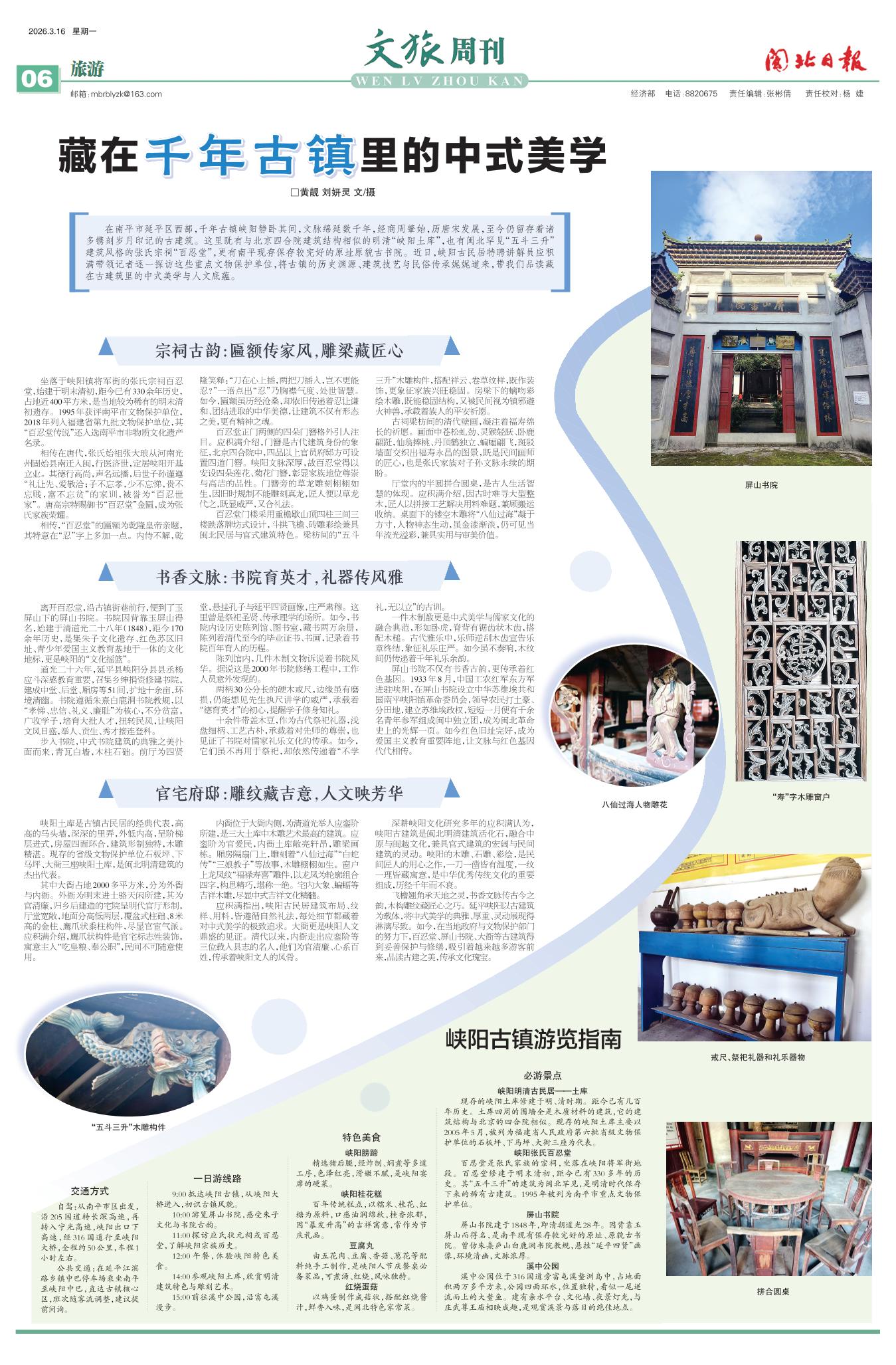 飞檐翘角承天地之灵,书香文脉传古今之韵,木构雕纹藏匠心之巧。延平峡阳以古建筑为载体,将中式美学的典雅、厚重、灵动展现得淋漓尽致。如今,在当地政府与文物保护部门的努力下,百忍堂、屏山书院、大衙等古建筑得到妥善保护与修缮,吸引着越来越多游客前来,品读古建之美,传承文化瑰宝。