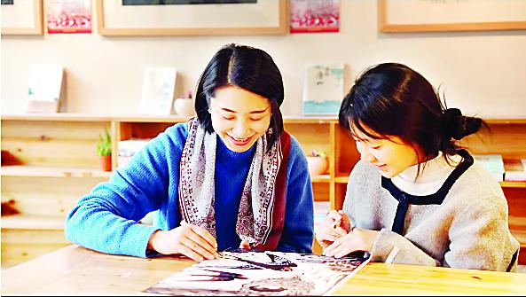 返乡青年陈雯(左)指导雕刻版画