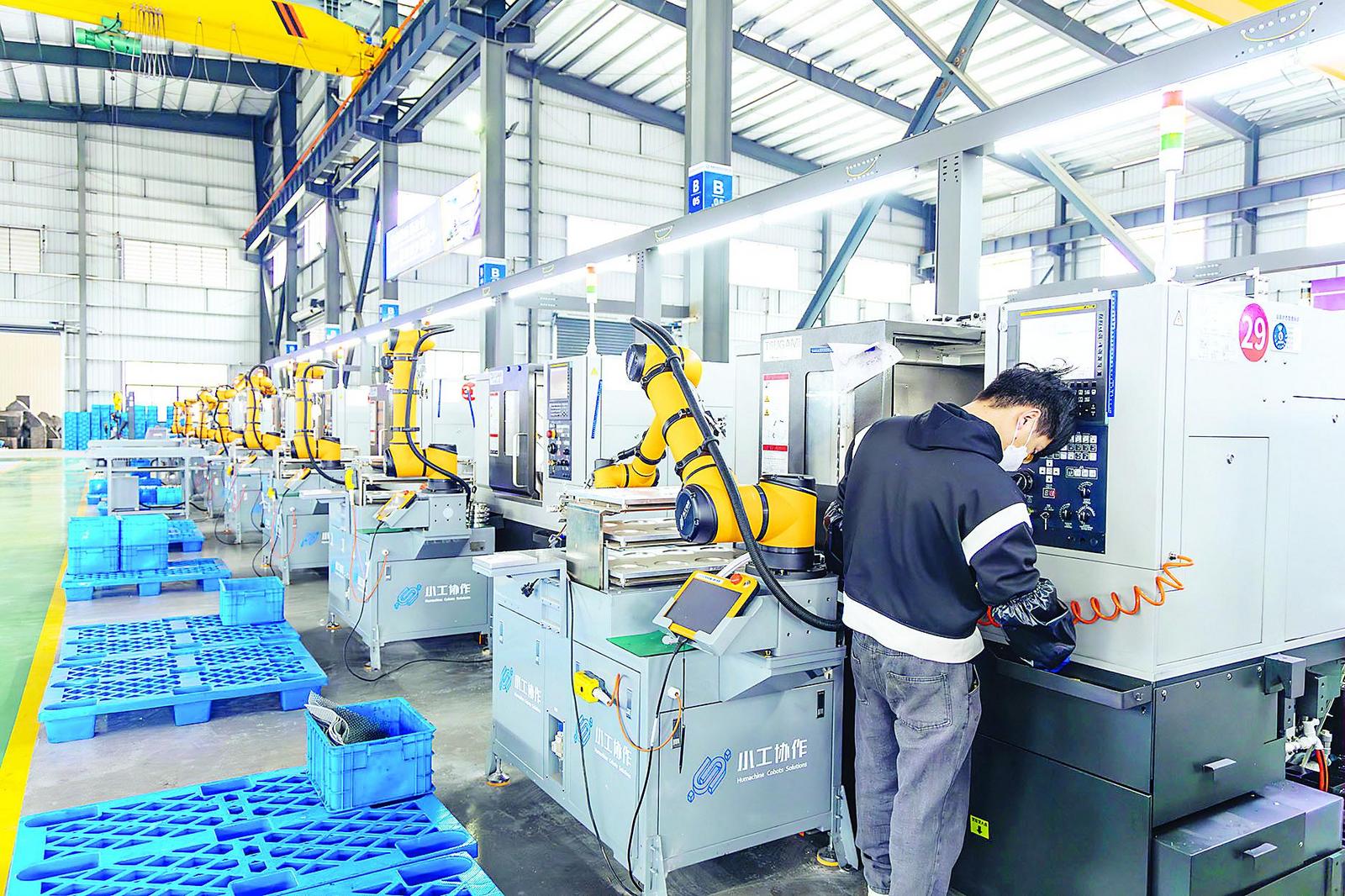 现代化智能制造车间内,机械臂与数控机床协同作业,工人正在操作数控设备调试生产参数。