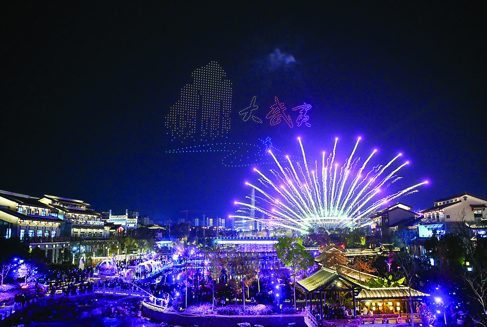 2025年12月31日,武夷山水城“武夷迎宾客 福聚山水城”新春嘉年华活动举行,图为现场无人机表演和烟花秀。