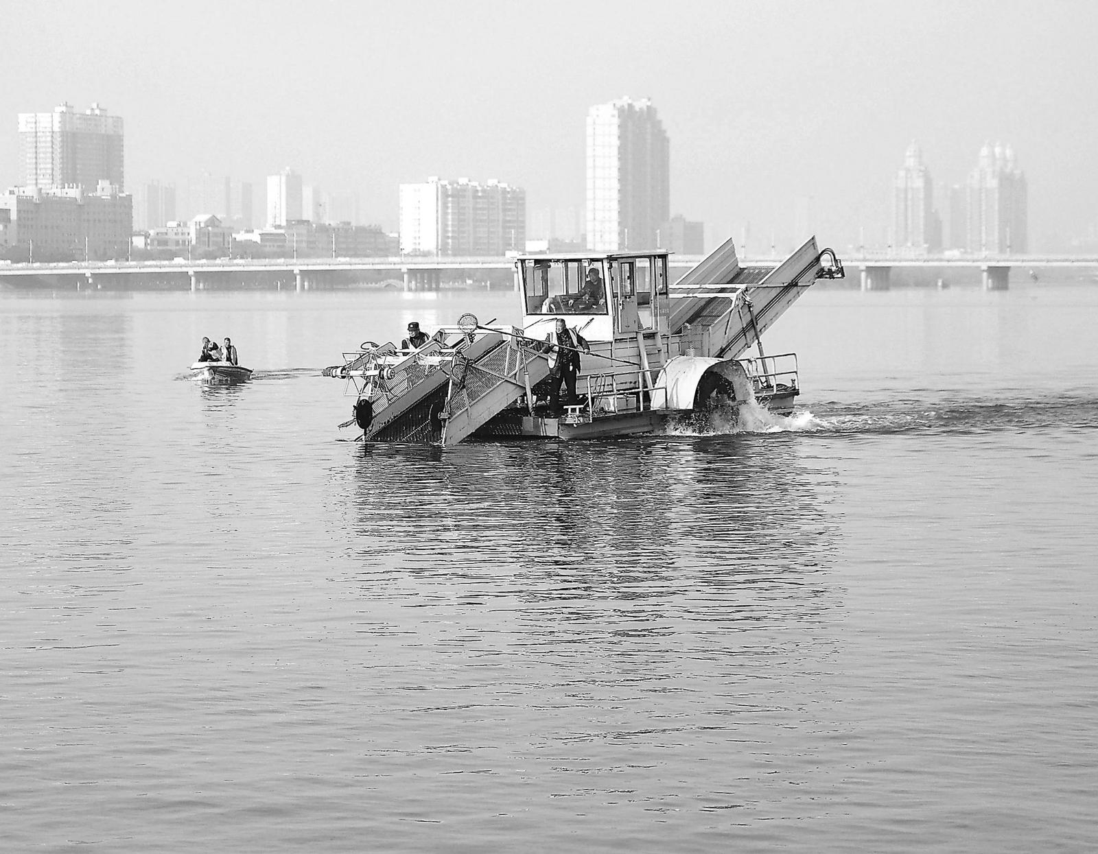 3月22日,在河南省南阳市白河槐香湾水域,工人驾驶大型清漂割草船在河面上清理水草。