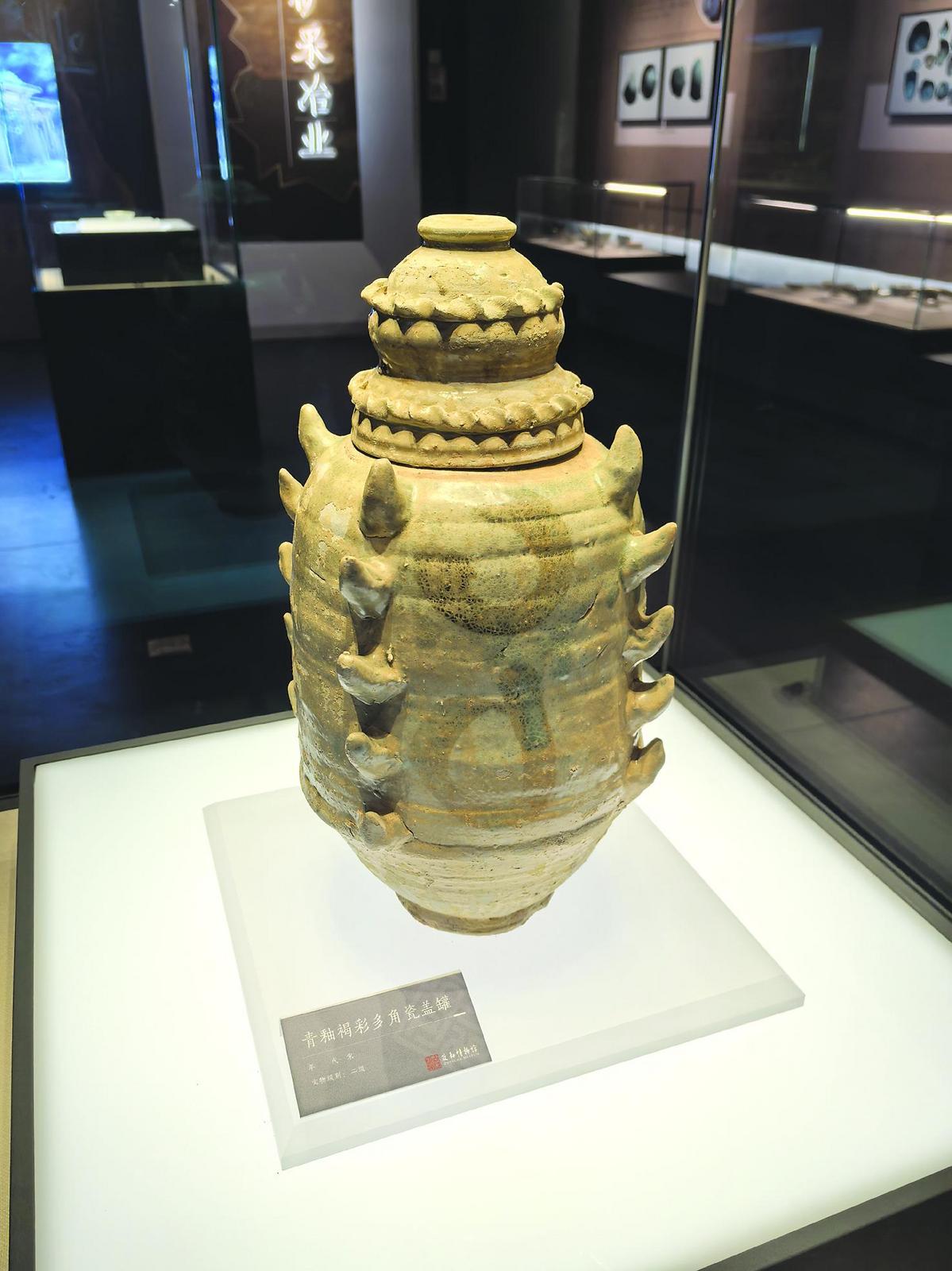 政和县博物馆内,一个制于宋代的青釉褐彩多角瓷盖罐静静地立在展柜里,以其独特造型吸引着人们的目光。该文物器盖呈双层葫芦塔形,每层堆贴水波纹一周,在灯光照射下延伸出对称的阴影;器身肩至下腹折收处,堆塑五层实心短角,每层四个,像嫩叶般向外伸展。