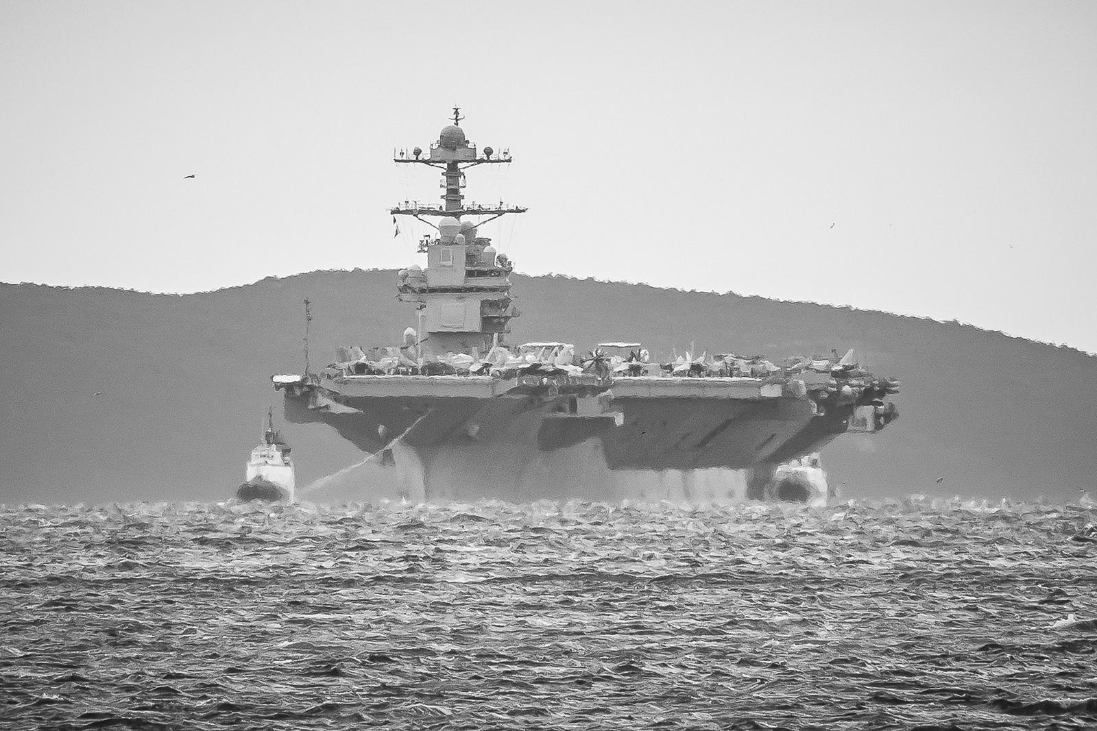 3月28日,美国海军“福特”号核动力航母驶入克罗地亚斯普利特港口水域。克罗地亚国防部3月28日在其官方社交媒体账号上宣布,美国海军“福特”号核动力航母当天驶入克罗地亚斯普利特港口水域。 (新华社发 Pixsell图片社/兹沃尼米尔 摄)