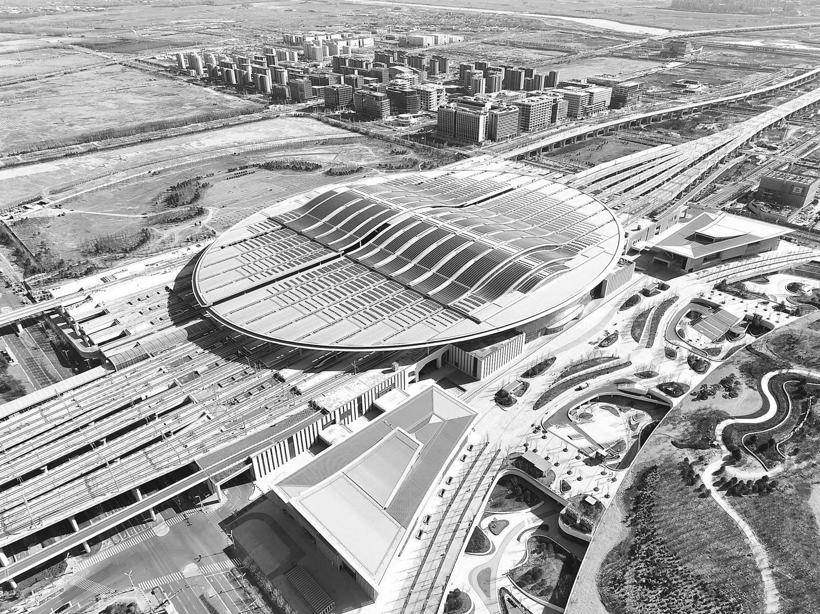 这是京雄城际铁路雄安站(3月18日摄,无人机照片)。京雄城际铁路雄安站站顶分布式光伏电站总装机容量6000千瓦,站顶铺设1.77万块、4.2万平方米多晶硅光伏组件,电站采用自发自用、余电上网模式,自2020年12月正式并网发电以来,已累计发电超过3100万千瓦时。 (新华社记者 朱旭东 摄)